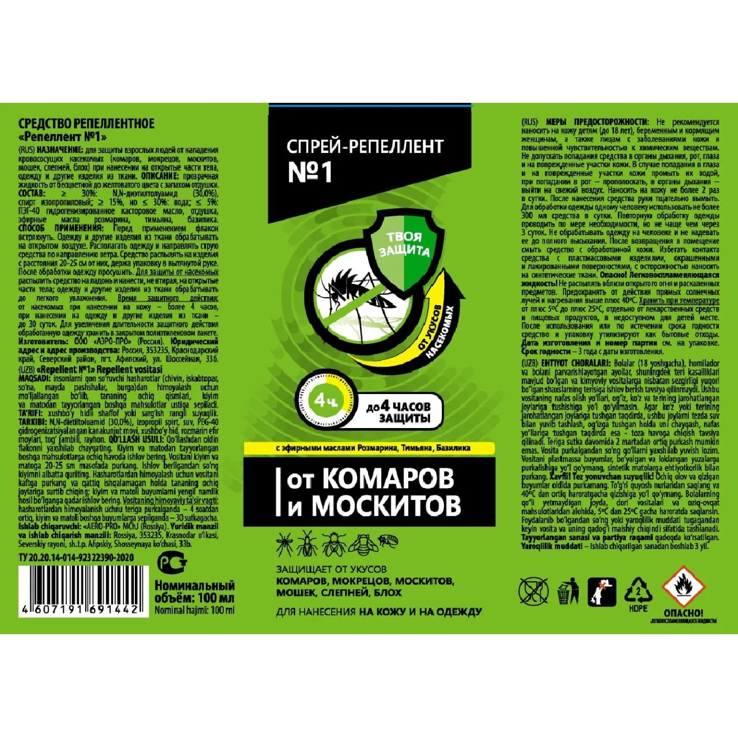 Состав: N,N-диэтилтолуамид (30,0%), спирт изопропиловый, вода, ПЭГ-40 гидрогенизированное касторовое масло, отдушка, эфирные масла розмарина, тимьяна, базилика.