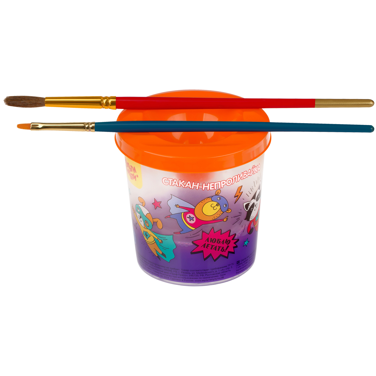 На крышке расположены выемки для кистей. Благодаря функциональной конструкции стакан устойчиво стоит на столе. Его объём идеально подобран под обхват детской руки.