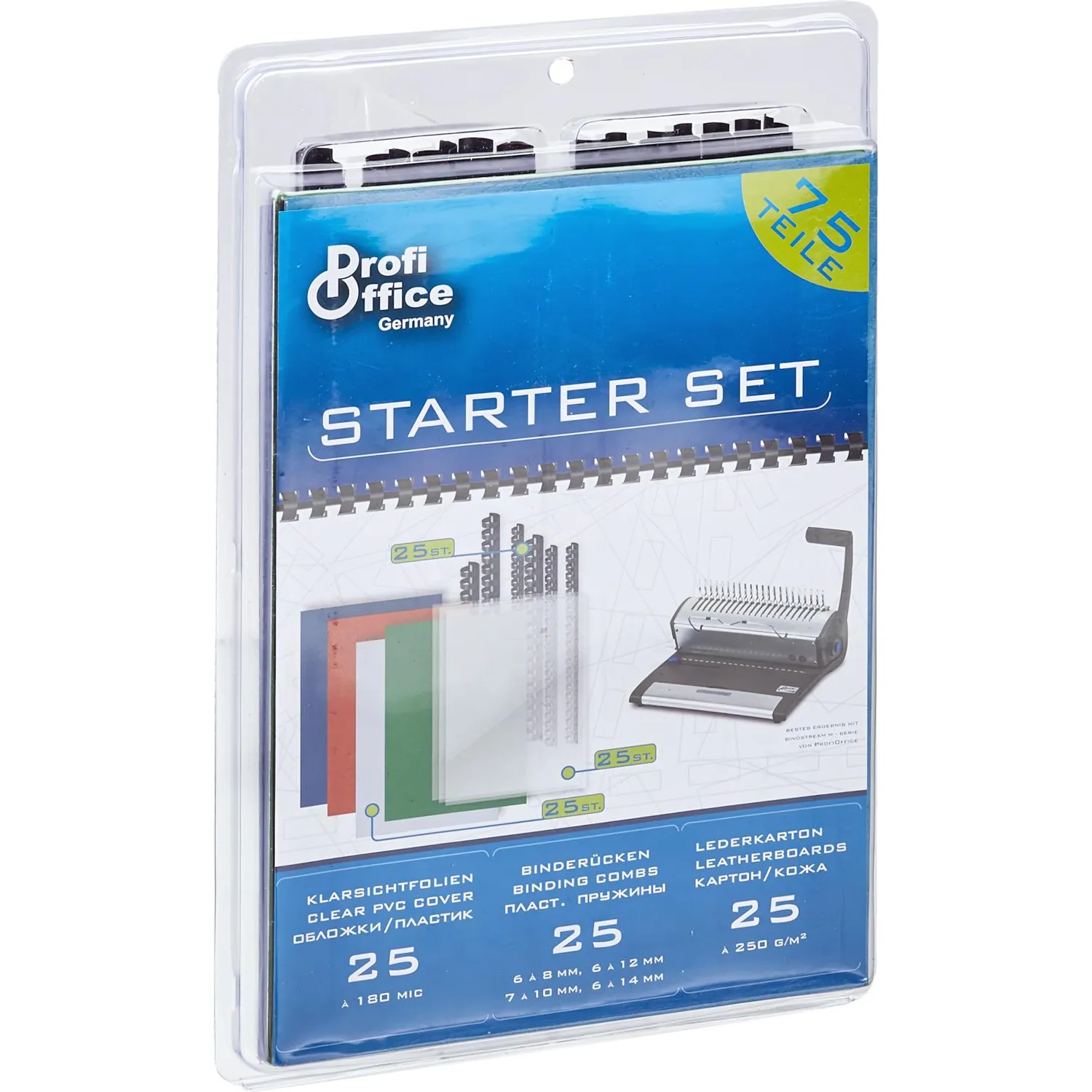 Стартовый набор для переплета ProfiOffice. При помощи одного такого набора вы сможете подготовить 25 различных брошюр. В его состав входят: обложки пластиковые прозрачные 25 шт., обложки картонные плотностью 230 г/кв.м с тиснением под кожу, различных цветов: белые, черные, красные, синие, зеленые (по 5 шт. каждого цвета). А также пружины пластиковые черного цвета, различных диаметров: 8 мм — 6 шт., 10 мм — 7 шт., 12 мм — 6 шт., 14 мм — 6 шт.