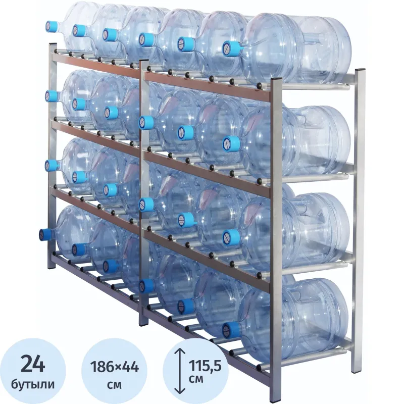 Стеллаж для бутилированной воды Комус Мебель (Cobalt) Бомис-24. Предназначен для организации хранения бутилированной воды в офисе, дома, на складе на минимальной площади. Полки стеллажа имеют оптимальный угол наклона, для удобства размещения и извлечения бутылей. Стеллаж оборудован подпятниками, что позволяет избежать повреждения напольного покрытия при его перемещении. Основание стеллажа не замкнуто, что удобно для уборки пола. Стеллаж имеет порошковое покрытие цвета металлик, устойчивое к истиранию. Толщина труб из стали равна 1,5 мм. Нагрузка на полку до 180 кг. Нагрузка на стеллаж до 528 кг.Конструкция стеллажа не позволяет компенсировать неровности пола. Стеллаж будет устойчивым, если его загрузить наполненными бутылями в соответствии с вместимостью.