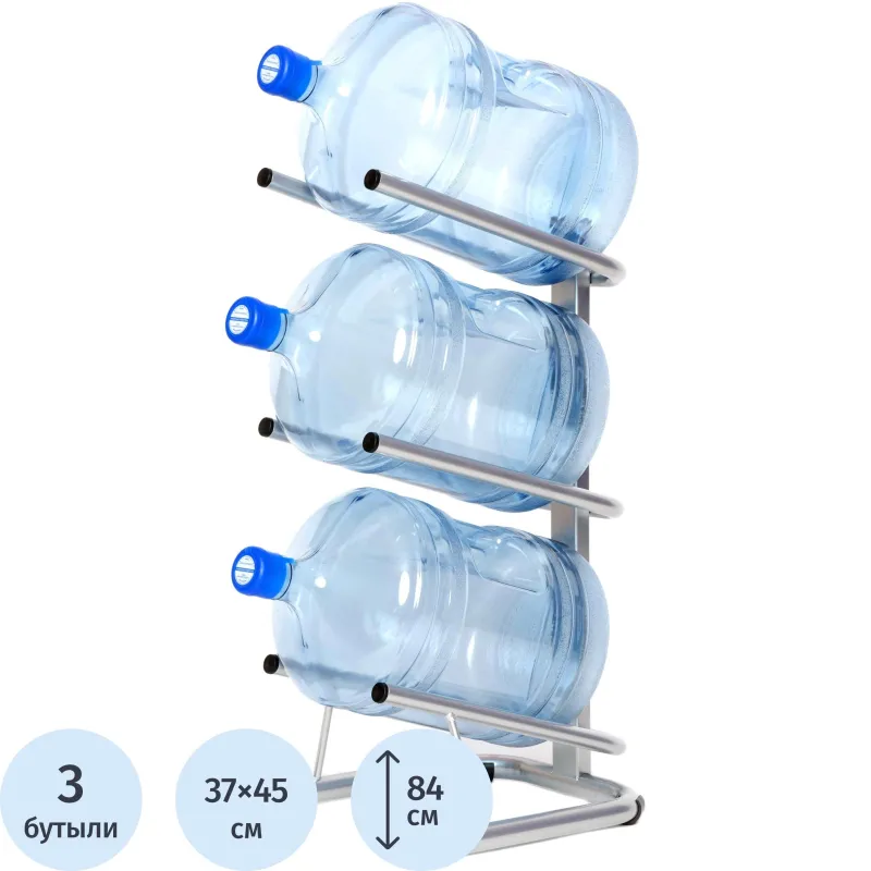 Стеллаж для бутилированной воды Комус Мебель (Cobalt) Бридж-3. Предназначен для организации хранения бутилированной воды в офисе, дома, на складе на минимальной площади. Полки стеллажа имеют оптимальный угол наклона, для удобства размещения и извлечения бутылей. Стеллаж оборудован подпятниками, что позволяет избежать повреждения напольного покрытия при его перемещении. Основание стеллажа не замкнуто, что удобно для уборки пола. Стеллаж имеет порошковое покрытие серого цвета, устойчивое к истиранию. Толщина труб из стали равна 1,5 мм. Нагрузка на полку до 25 кг.Конструкция стеллажа не позволяет компенсировать неровности пола. Стеллаж будет устойчивым, если его загрузить наполненными бутылями в соответствии с вместимостью.