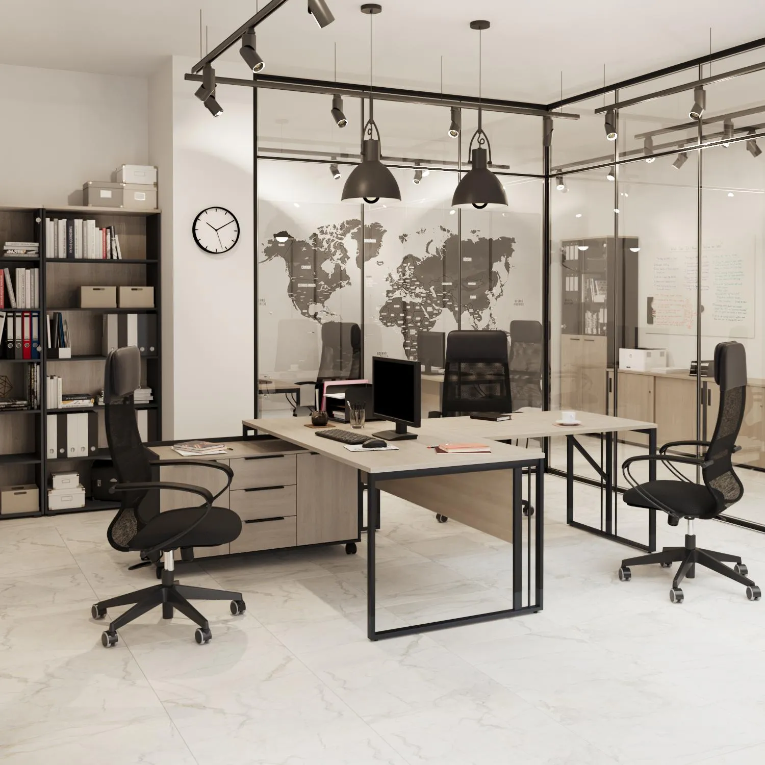 Стеллаж для документов. Топ стеллажа выполнена из ЛДСП толщиной 22 мм с кромкой толщиной 2 мм по передней стороне, остальные детали, включая заднюю стенку — из плиты ЛДСП толщиной 16 мм с кромкой толщиной 1 мм и 0,5 мм. Стеллаж установлен на регулируемые по высоте опоры чёрного цвета. К стеллажу рекомендованы фасады из ЛДСП или стекла (арт. 2014650, 2014651).