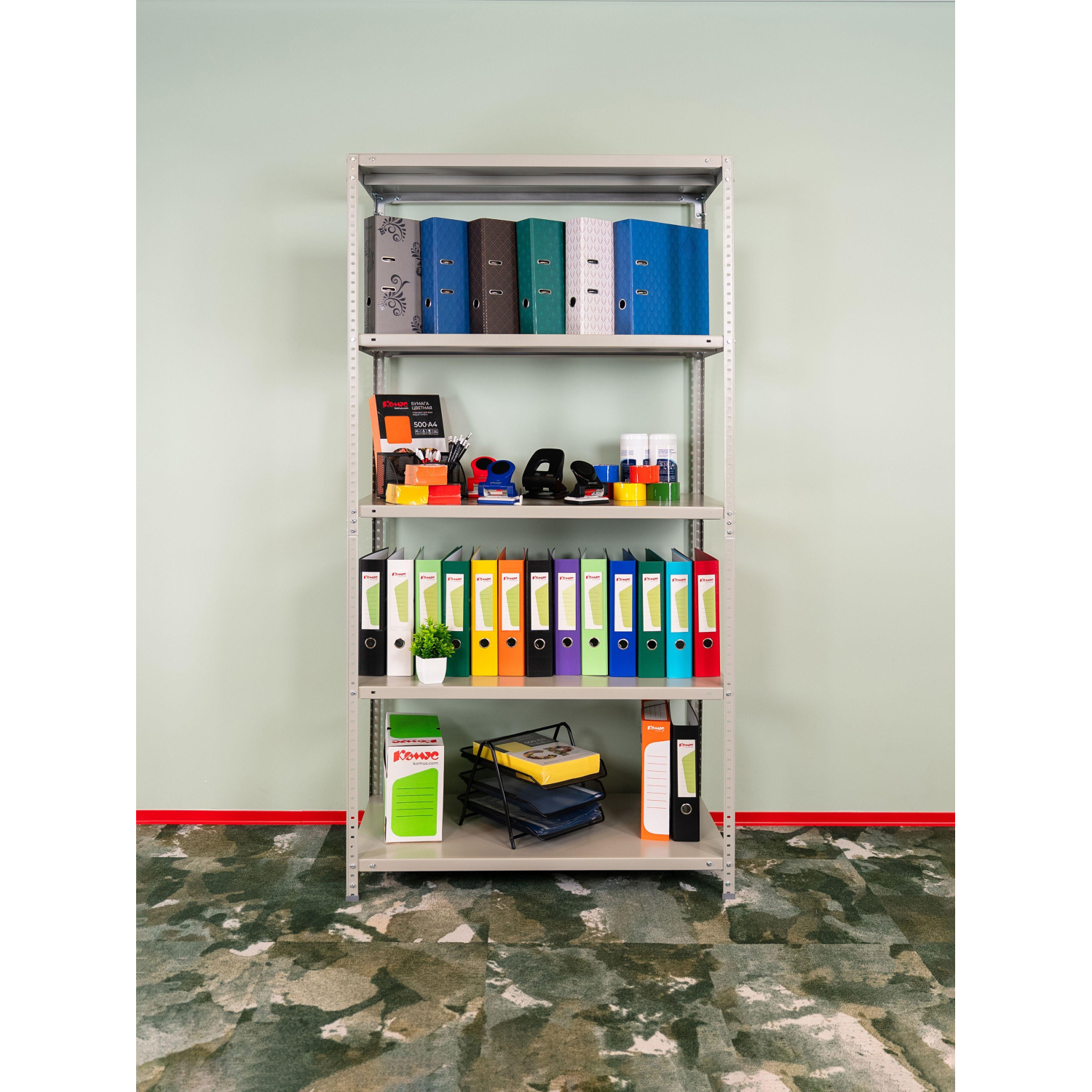 Стеллаж офисный предназначен для хранения документов и различных грузов в офисе, на складе, в архиве. Стойки с усиленным угловым профилем сложного сечения 30×30 мм. Разборная стойка. Г-образный усилитель стоек и полок. Равномерно распределённая нагрузка на полку — 100 кг. Высота бокового ребра полки — 33 мм. Шаг регулирования высоты полок — 25 мм. Максимальная нагрузка на стеллаж в стандартной комплектации — 500 кг. Пластиковые опоры подпятников. Цвет стеллажа серый с порошковым покрытием.