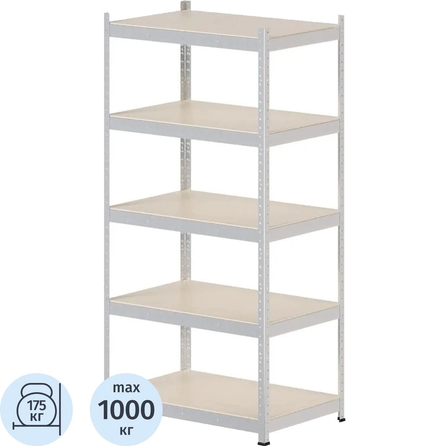 Стеллаж металлический — это недёжное и функциональное решение для хранения различных предметов. Изготовлен из оцинкованной стали, что обеспечивает его долговечность и устойчивость к коррозии. Стеллаж имеет размеры (ШхГхВ) 912×600×1824 мм, что позволяет разместить на нём большое количество предметов. В комплекте 5 полок из МДФ, что обеспечивает удобство использования и возможность регулировки высоты полок с шагом 38 мм. Нагрузка на полку 175 кг. Сборка стеллажа осуществляется без использования инструментов и болтов, благодаря специальным пазам. Это позволяет быстро и легко собрать стеллаж, не повреждая стены и пол. Стеллаж металлический имеет стильный серебристый цвет, который легко впишется в любой интерьер. Пластиковые подпятники на ножках обеспечивают защиту напольного покрытия от повреждений. Он может использоваться для хранения овощей и фруктов на кухне, для размещения обуви в коридоре, для хранения одежды в гардеробе, для организации рабочего пространства в офисе и т.д. Выдерживает общую нагрузку до 1000 кг, что делает его недёжным и устойчивым.