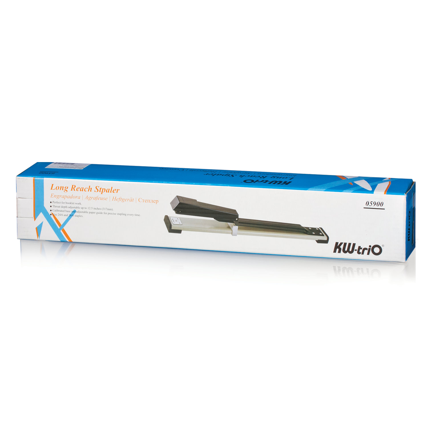 Степлер-брошюровщик KW-trio 5900 предназначен для скрепления крупноформатных документов. Металлический механизм позволяет сшивать открытым и закрытым способами документы толщиной до 20 листов, добавлять документы к готовым брошюрам и регулировать глубину закладки бумаги до 317 мм. Корпус выполнен из пластика черного цвета. Степлер использует металлические скобы размеров № 24/6. Размер изделия 397×52×70 мм. Вместимость скоб — 100 штук.