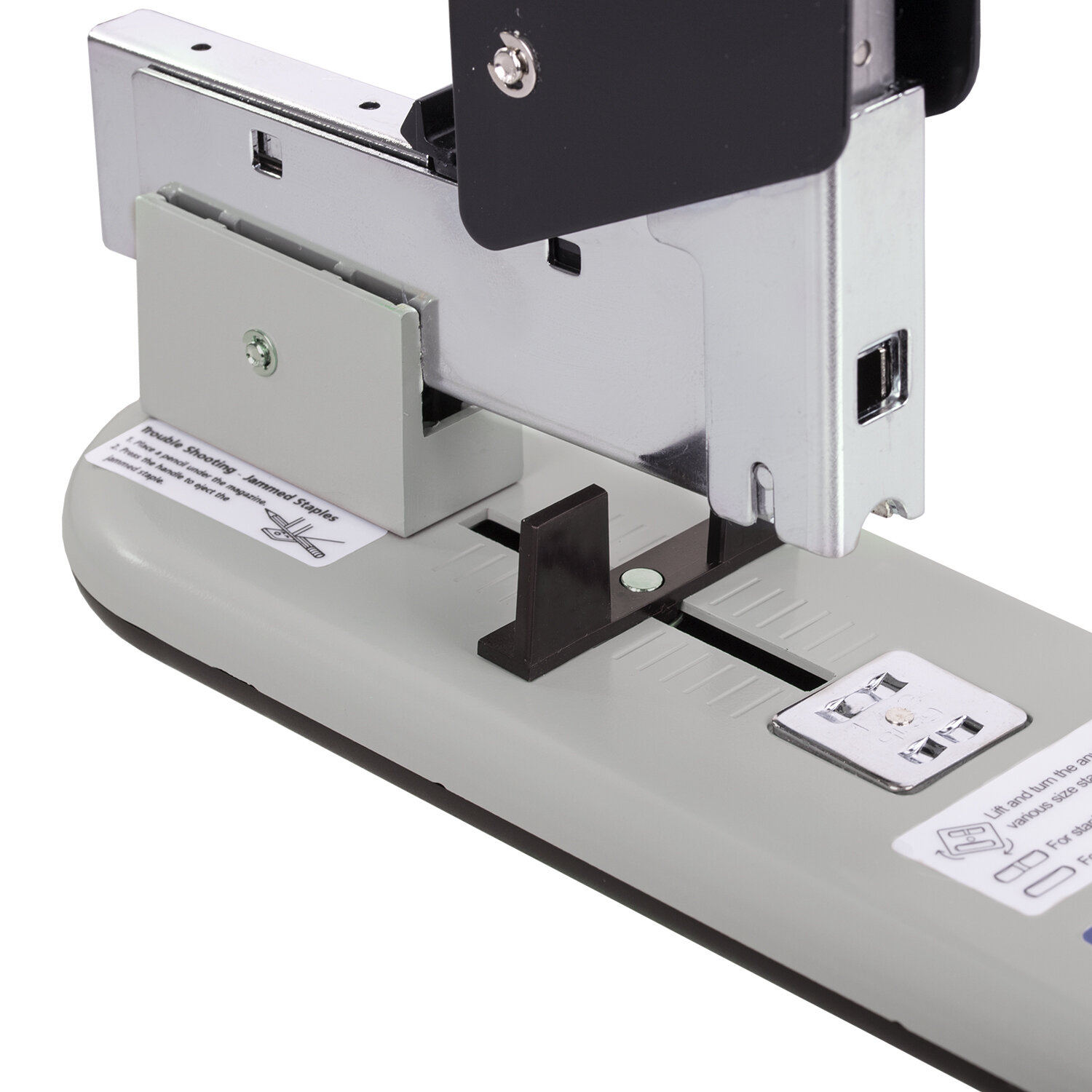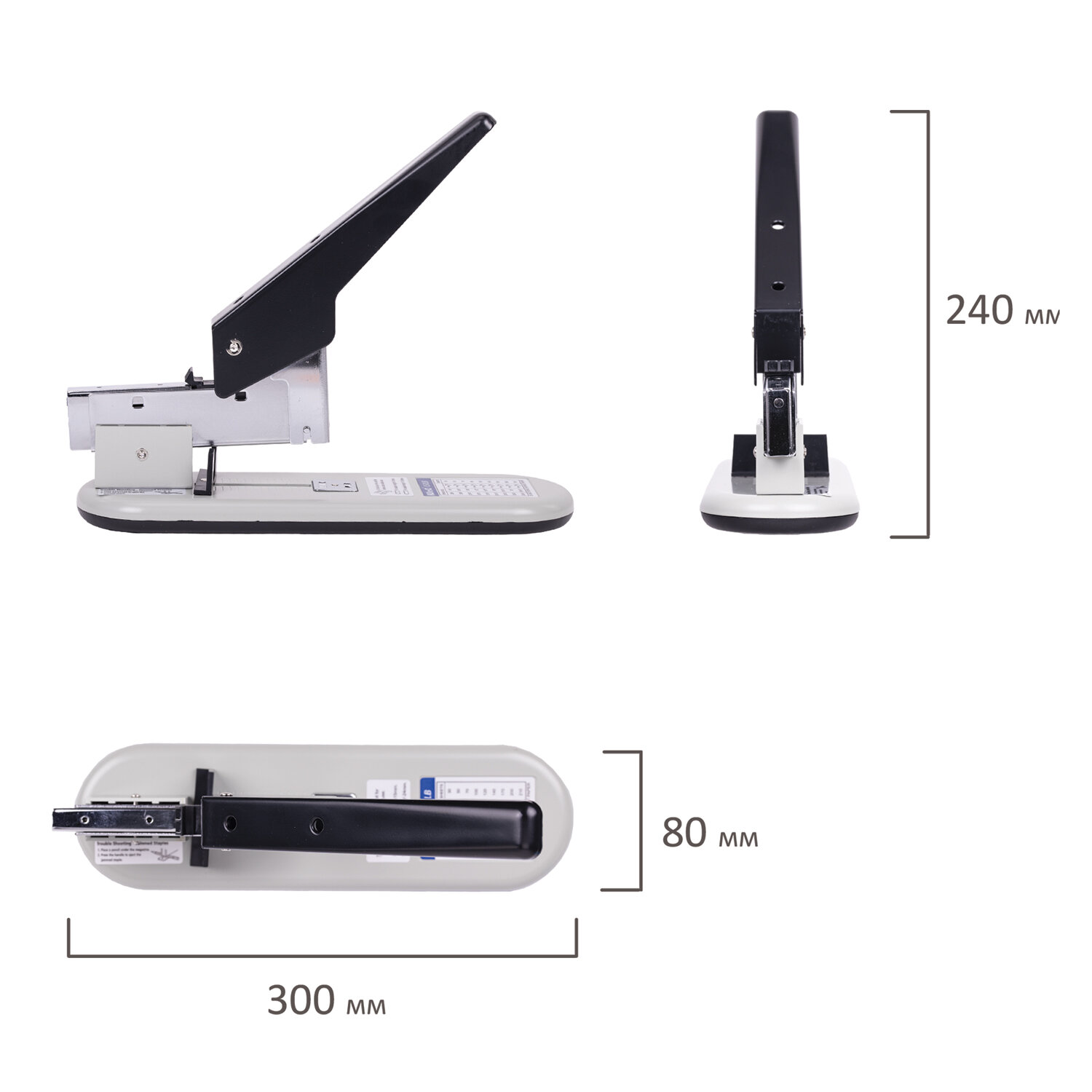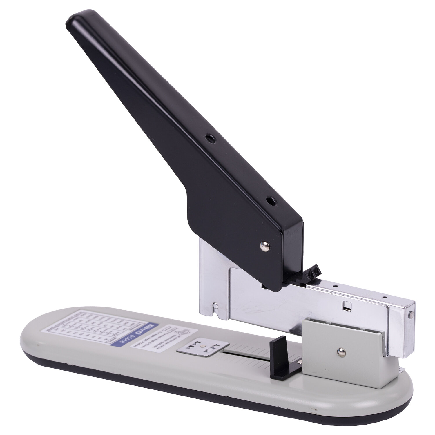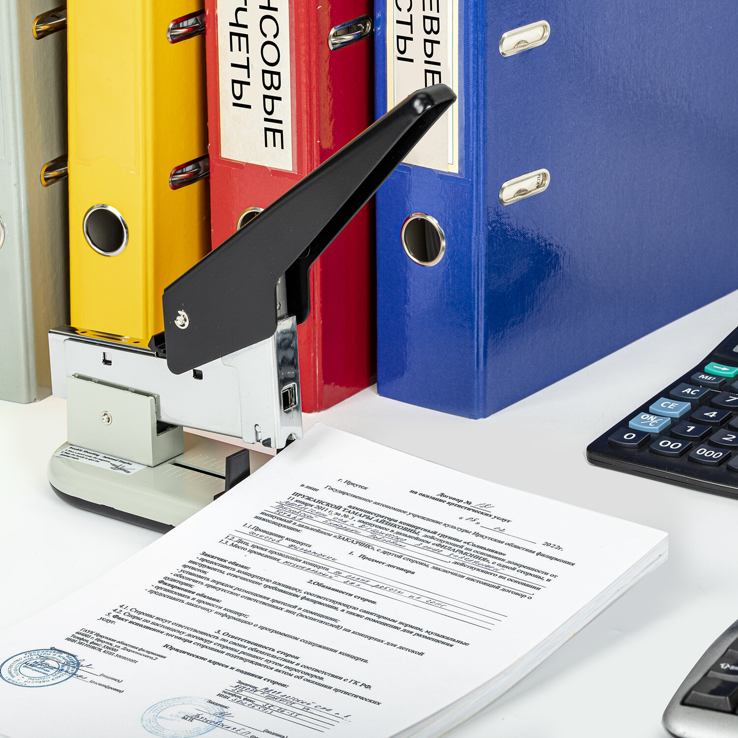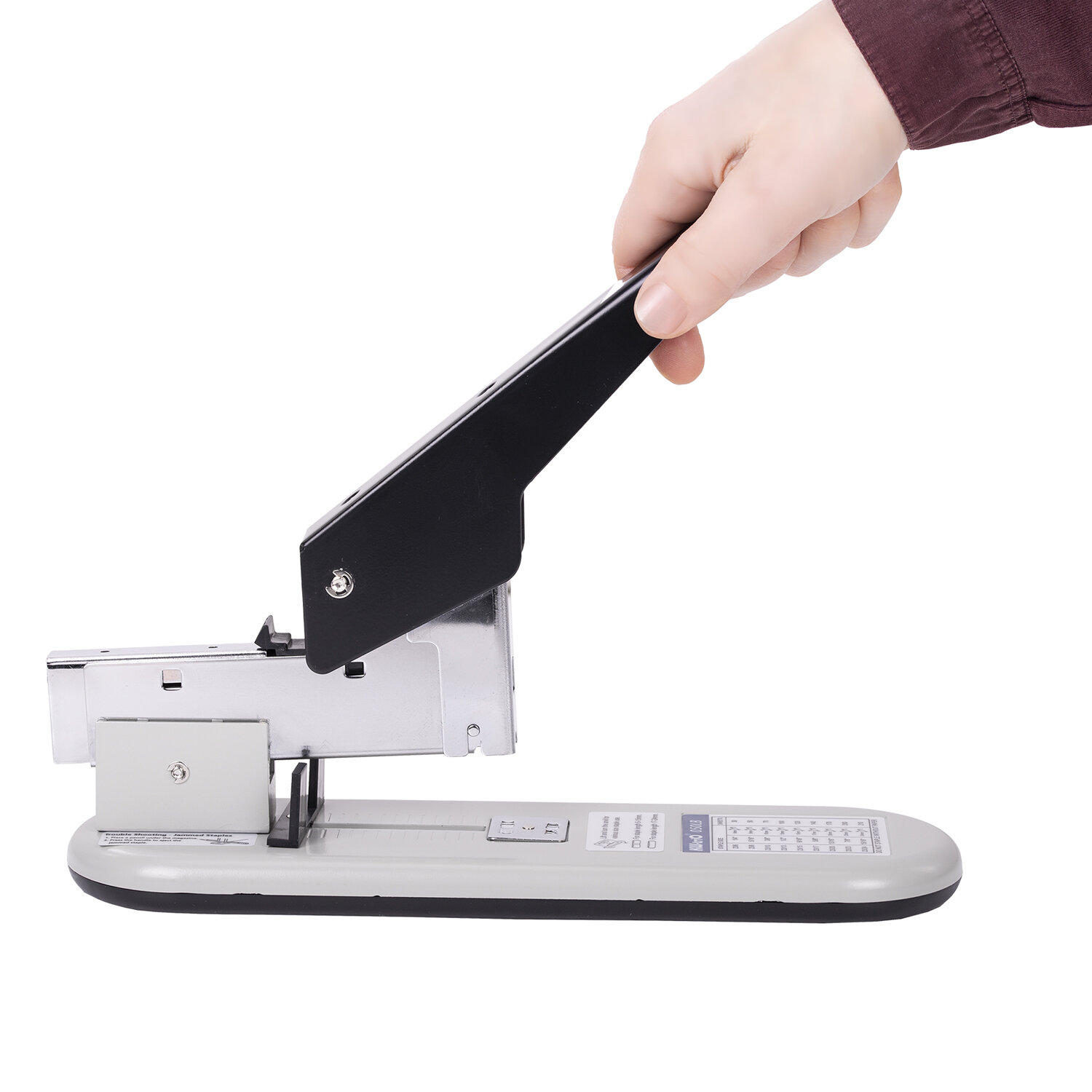 Для эффективного сшивания максимально допустимого объема бумаги необходимо расположить степлер на горизонтальной твердой поверхности, прикладывая усилия, плавно надавить на рычаг (при необходимости двумя руками), разномерно распределяя усилия по поверхности рычага.