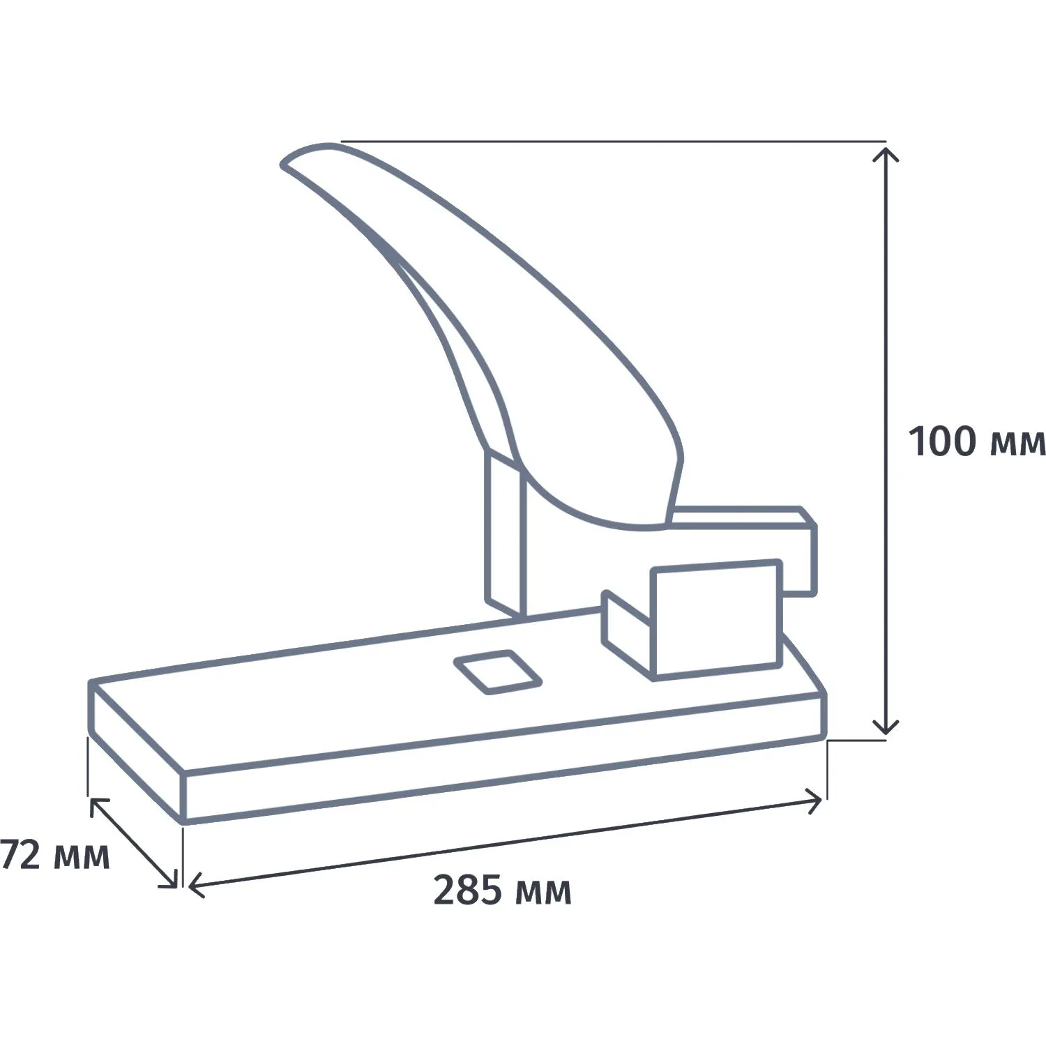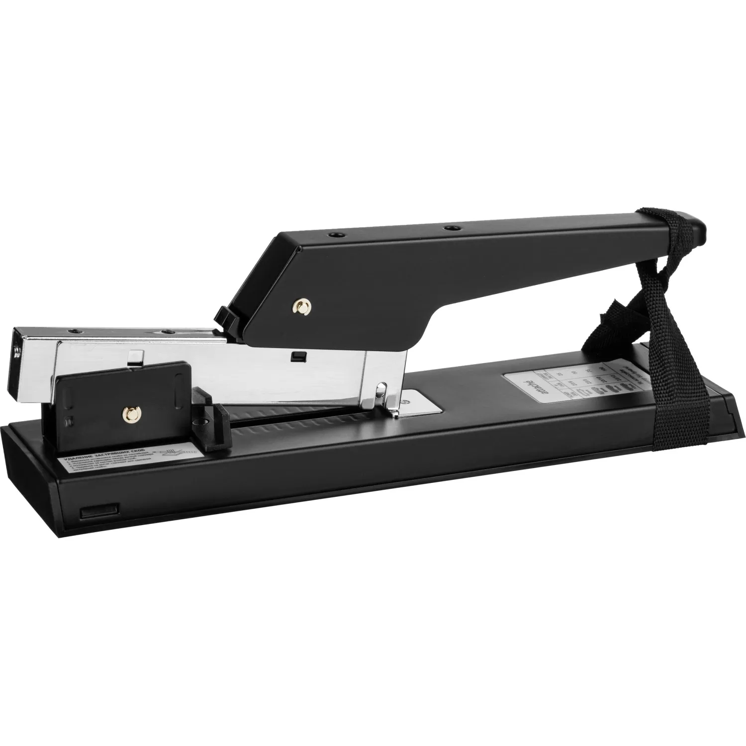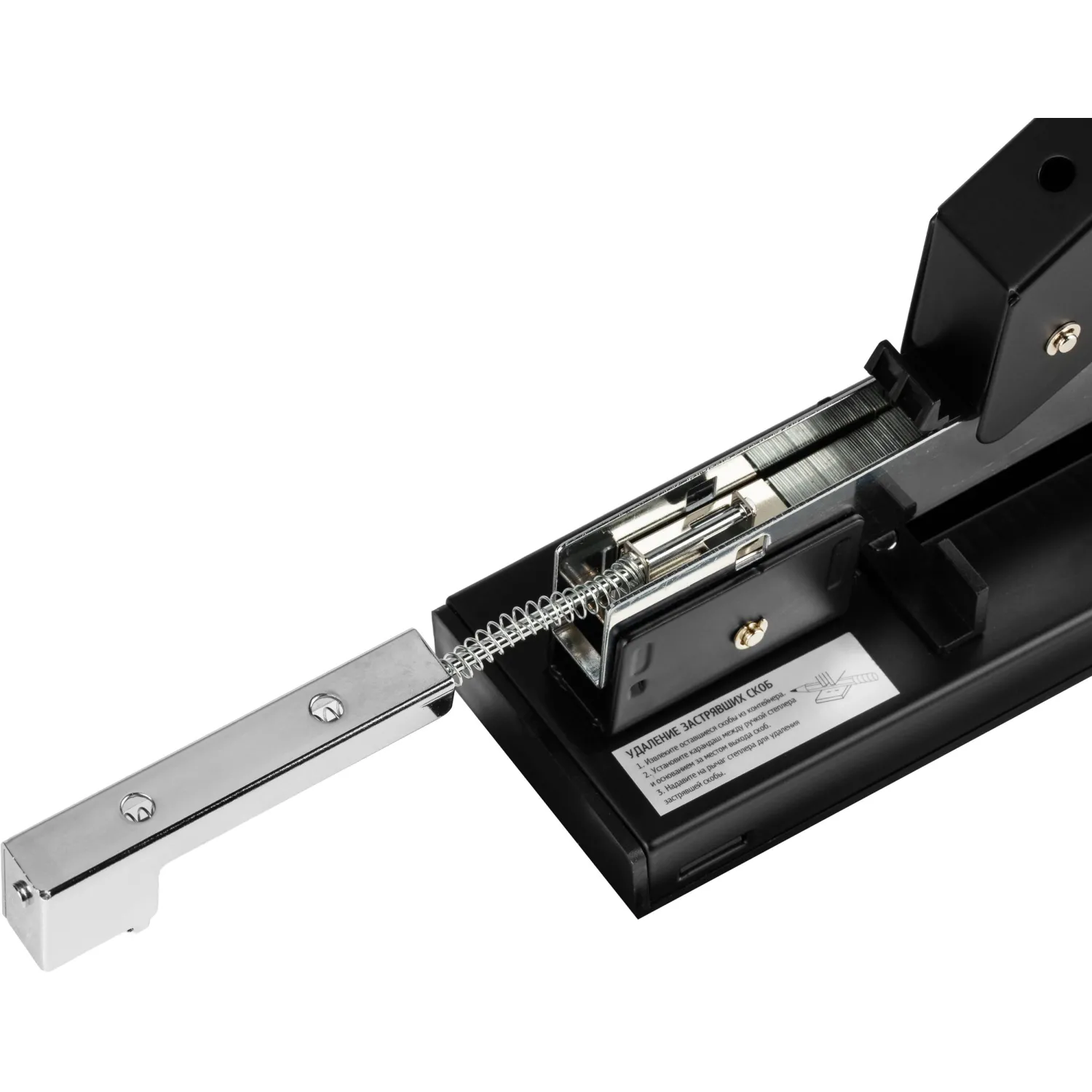 Мощный степлер с максимальной толщиной сшивания бумаги до 100 листов. Глубина закладки листов регулируется от 7 до 70 мм. Пластиковая основа степлера не царапает поверхность стола и предотвращает скольжение. Загрузка скоб в степлер осуществляется фронтально. Тип и размер используемых скоб: N23/6, 23/8, 23/10, 23/13 Вместимость скоб: 100 штук. Инструкция по удалению застрявших скоб:1. Извлеките оставшиеся скобы из контейнера. 2. Установите карандаш между ручкой степлера и основанием за местом выхода скоб. 3. Надавите на рычаг степлера для удаления застрявшей скобы. Для эффективного сшивания максимально допустимого объёма бумаги необходимо расположить степлер на горизонтальной твёрдой поверхности, прикладывая усилия, плавно надавить на рычаг (при необходимости двумя руками), разномерно распределяя усилия по поверхности рычага.