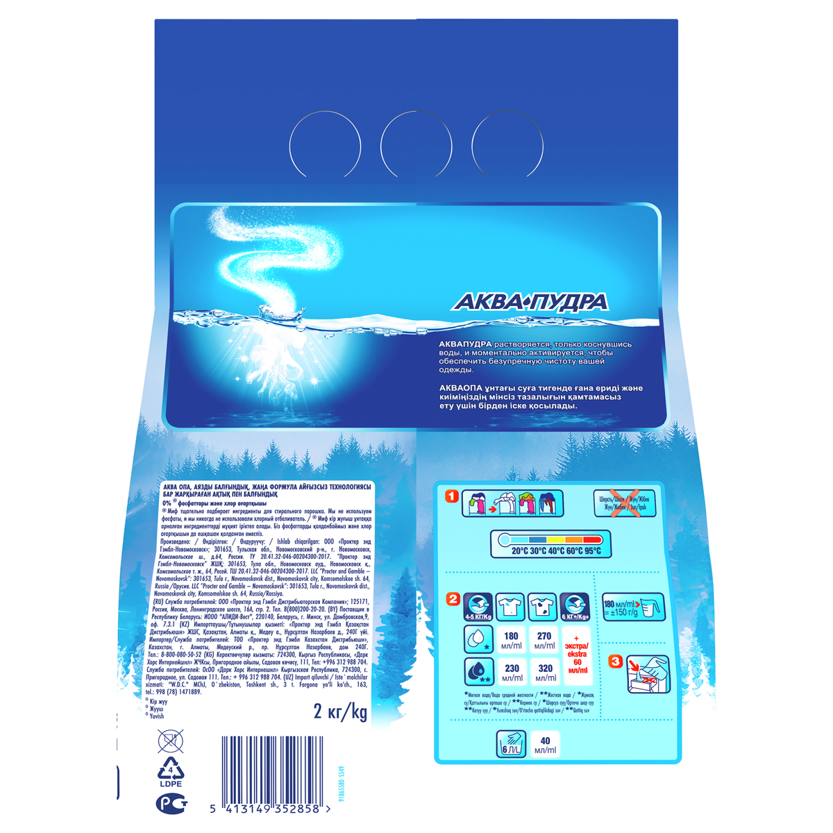 Способ применения: для достижения наилучших результатов используйте 150 г стирального порошка на 1 загрузку белья (до 5 кг).