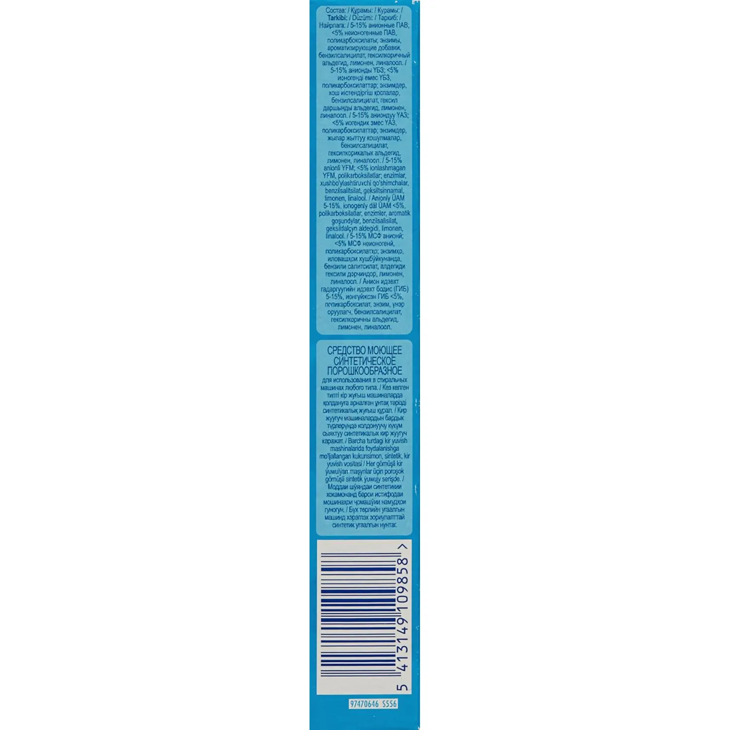Состав: 5%-15% анионные ПАВ, <5% неионогенные ПАВ, отбеливающее вещество на основе кислорода, поликарбоксилаты, энзимы, оптические отбеливатели, ароматизирующие компоненты, бензилсалицилат, гексилкоричный альдегид, лимонен, линалоол.