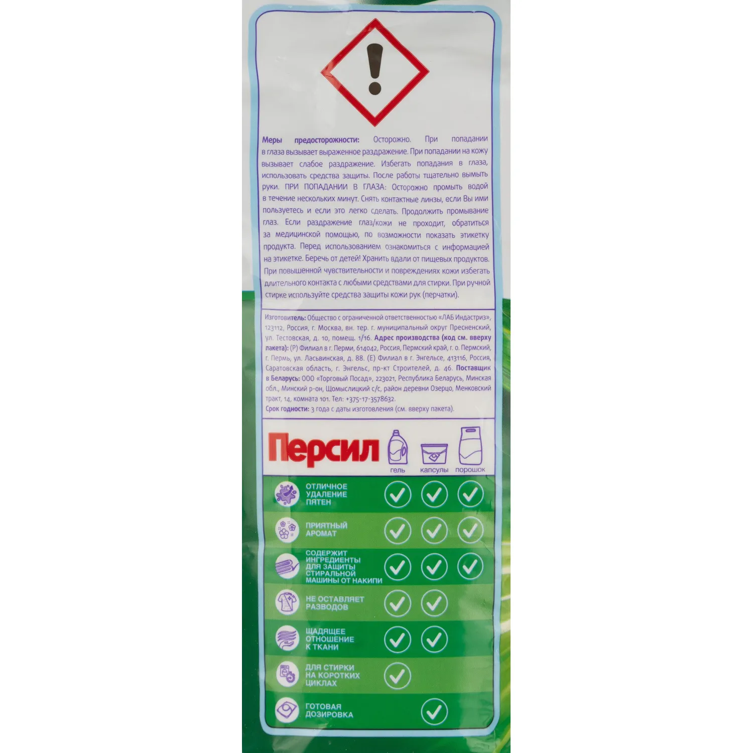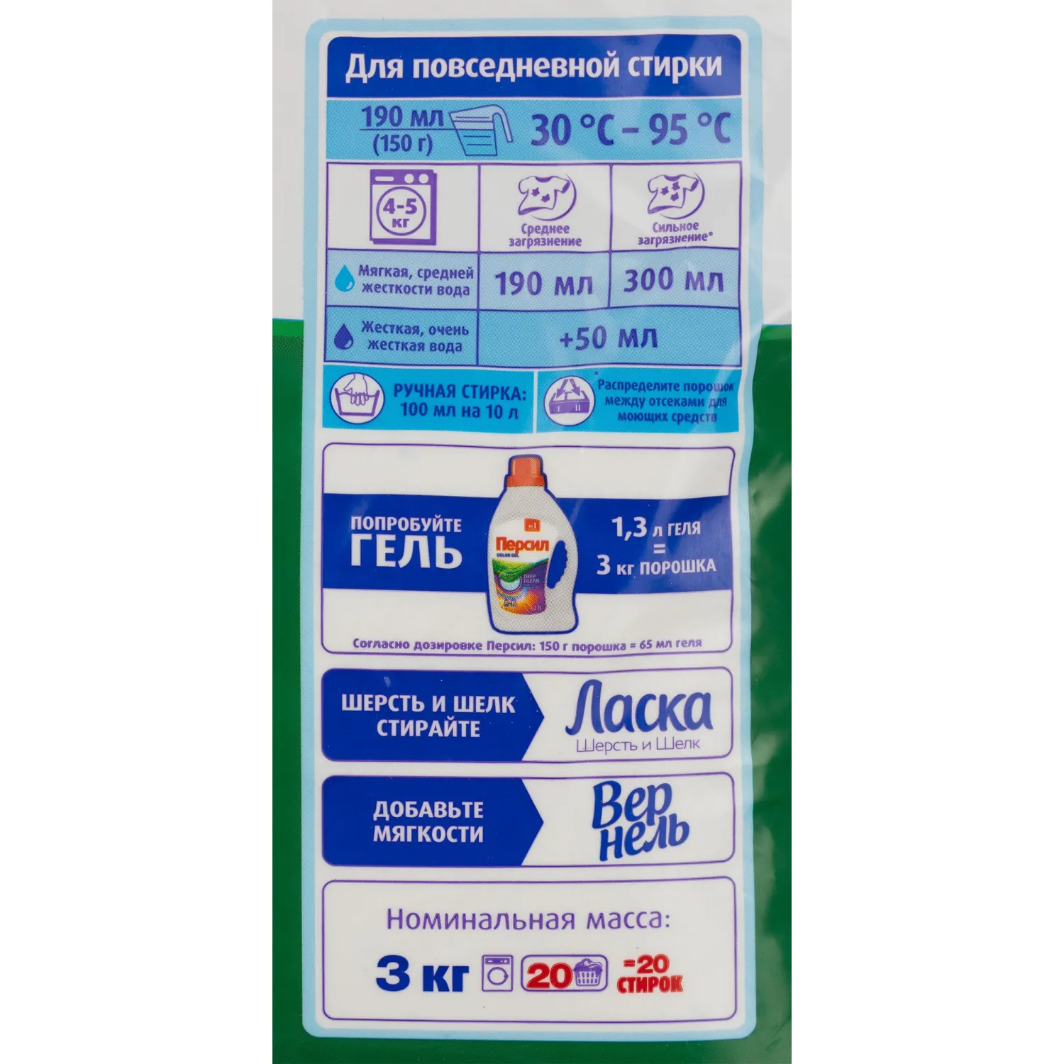 Назначение: для стирки изделий из х/б, льняных, синтетических тканей и тканей из смешанных волокон в стиральных машинах-автоматах в воде любой жёсткости. Для изделий из шерсти и шёлка используйте специальные моющие средства