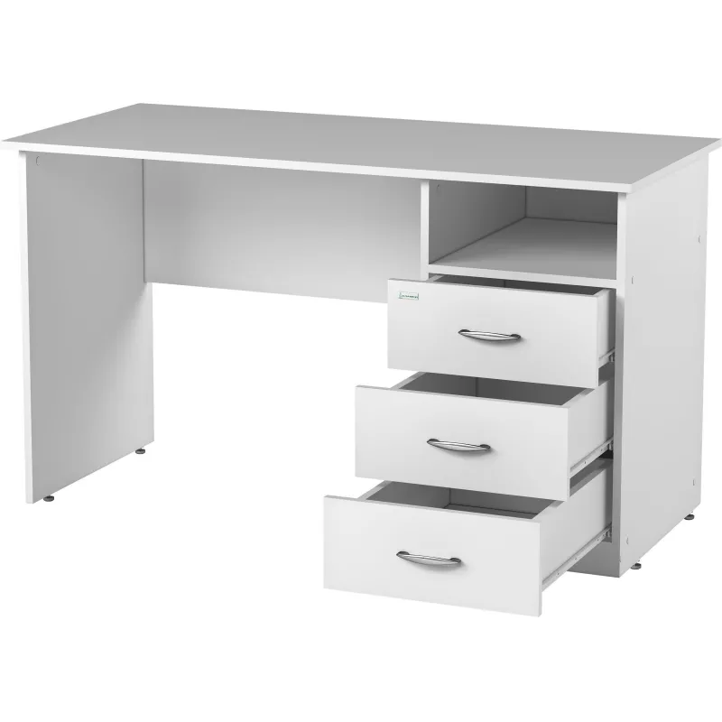 Стол медицинский Еламед Модуль 3 изготовлен из ЛДСП. Стол оснащён встроенной тумбой с тремя выдвижными ящиками глубиной 484 мм и нишей под столешницей. Габаритные размеры: 1300×600×750 мм. Возможны отклонения в замерах на +4 мм.
