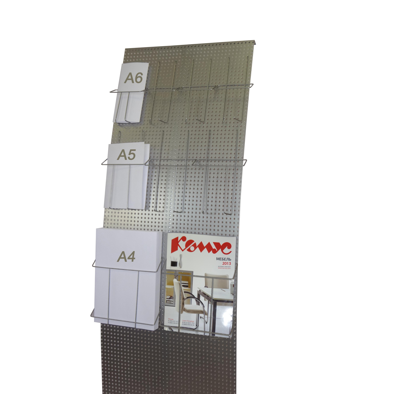Буклетница напольная для полиграфии и информации изготовлена из металлического перфорированного листа и профиля 20×20 мм. Покрытие из порошковой эмали цвета хром. Размеры стойки — 160×45,7×36 см. Съемное основание делает ее удобной для транспортировки. Стойка поставляется без навесных элементов. Отдельно можно приобрести карманы различного формата: арт. 172258, 172259, 373189, 373190, 373191.