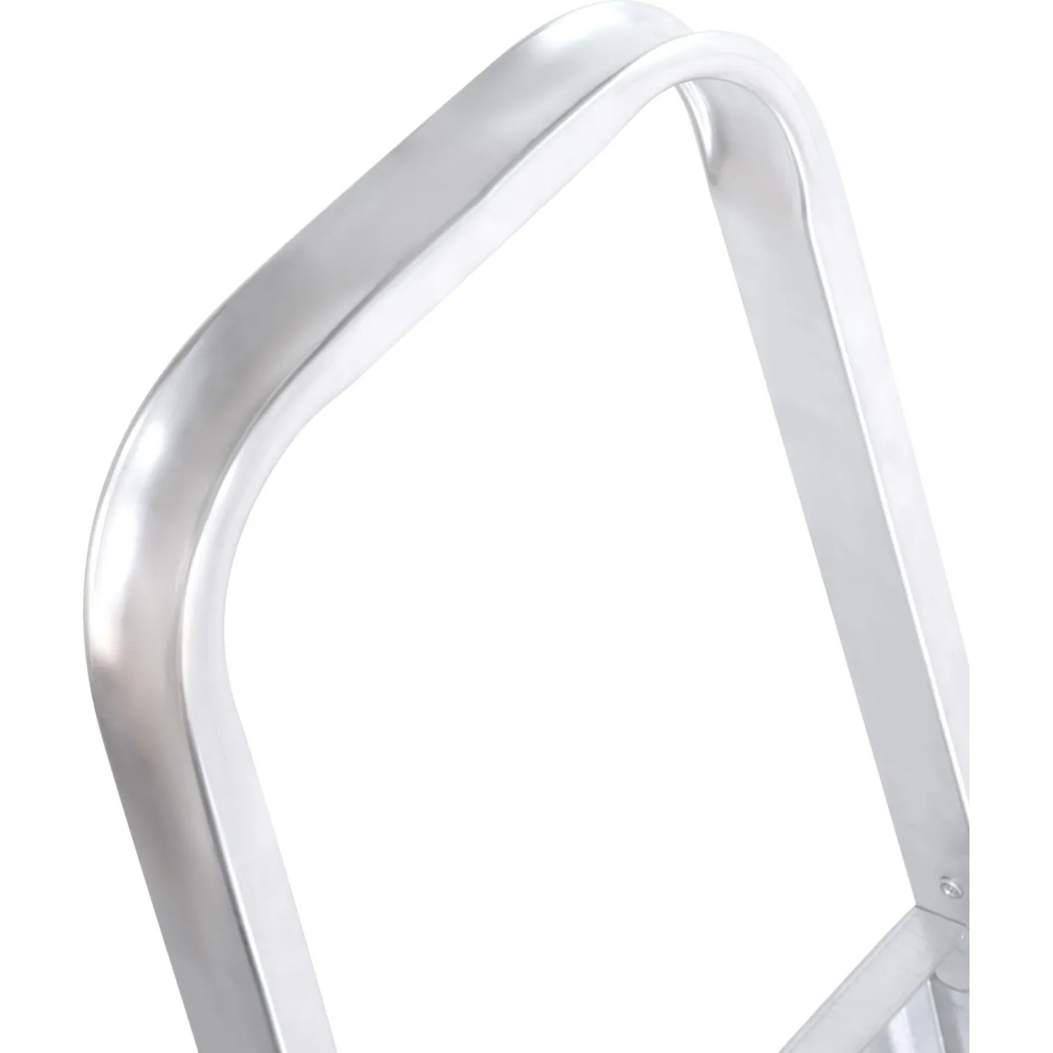 — Рифлёная поверхность ступеней шириной 80 мм исключает соскальзывание стопы. Сверху стремянки есть дуга безопасности для защиты от падения.