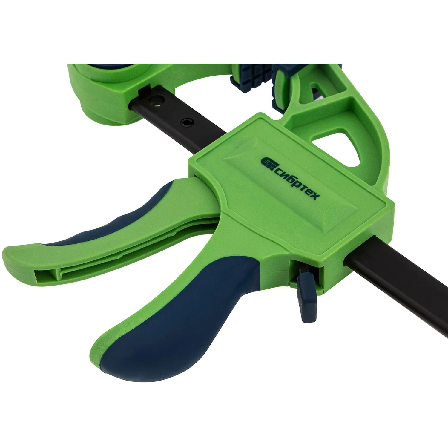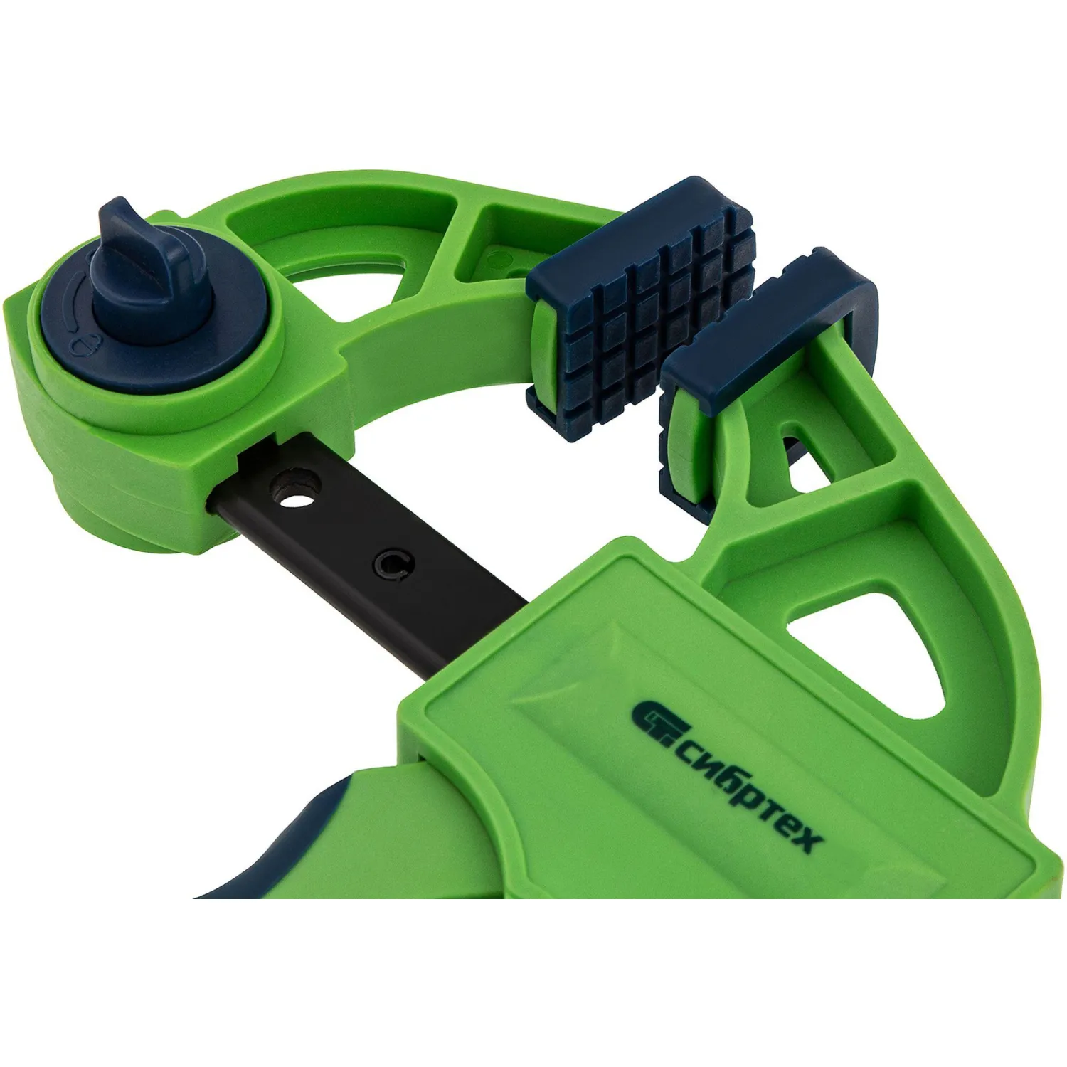 Струбцина изготовлена из ударопрочного пластика. Направляющая стальная. Рабочие губки снабжены накладками для предотвращения повреждений обрабатываемых предметов. Опорная губка перемещается и фиксируется по всей длине направляющей при помощи рукоятки, а также может переставляться на другой конец направляющей, что позволяет использовать струбцину 'на разжим'.