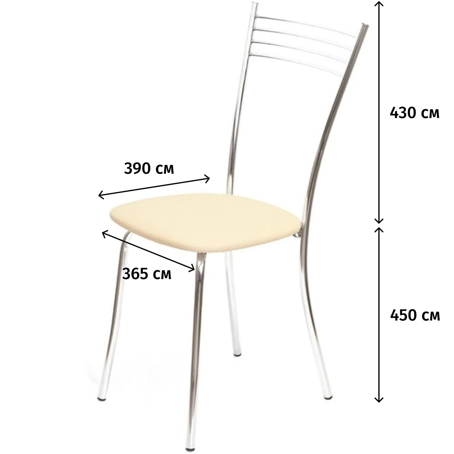Габариты стула — 365×390×430 мм. Максимальная статическая нагрузка — 120 кг. Подлокотников нет.