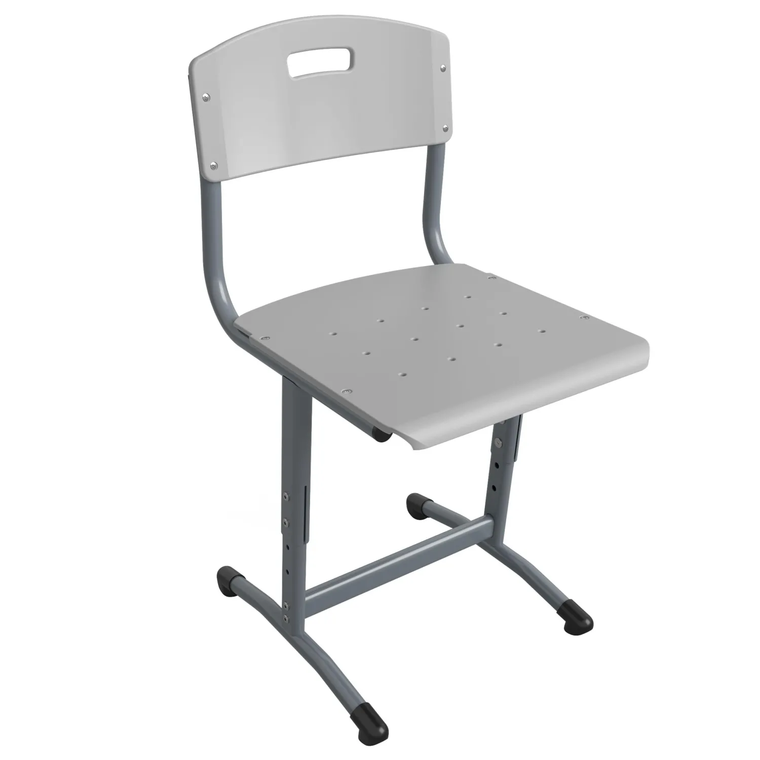 Стул ученический Универсал. Сиденье и спинка пластиковые, изготовлены из пропилена, толщиной не менее 5 мм. Металлический каркас разборный и выполнен из профиля круглого сечения диаметром 25 мм с толщиной стенки не менее 1,5 мм и плоскоовального профиля 40×20 мм и 45×25 мм с толщиной стенки не менее 1,5 мм. Каркас покрыт порошковой краской, стойкой к химическим и механическим воздействиям. На свободных концах труб установлены заглушки из ударопрочных полимеров. Каркас стула имеет полимерные подпятники, предотвращающие повреждение напольного покрытия. Сиденье и спинка крепятся к основанию при помощи саморезов. Стойка стула имеет наклон вперёд 5 градусов. Механизм регулировки высоты — телескопический. Регулировка высоты осуществляется с помощью винтовых соединений. Нижняя опора стула имеет изогнутую форму с двумя точками изгиба. Стул имеет цветовую маркировку в соответствии с ростовой группой. Стул изготавливается в соответствии с ГОСТ 11016-2024.