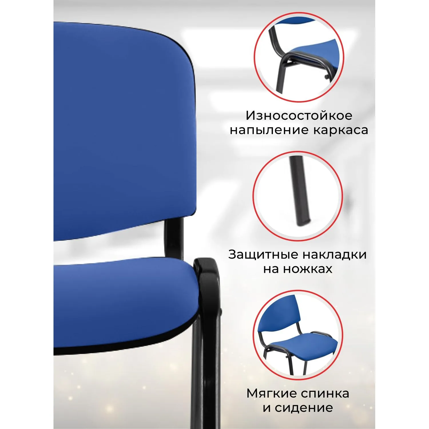 Стул офисный Изо на металлическом каркасе, покрытом износостойкой краской черного цвета. Обивка выполнена из высококачественной искусственной кожи синего цвета. Задняя часть спинки из пластика черного цвета.