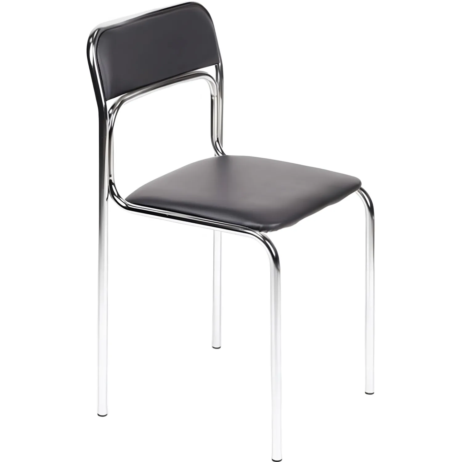Стул офисный с сиденьем и спинкой из искусственной кожи чёрного цвета. Каркас выполнен из хромированного металла.