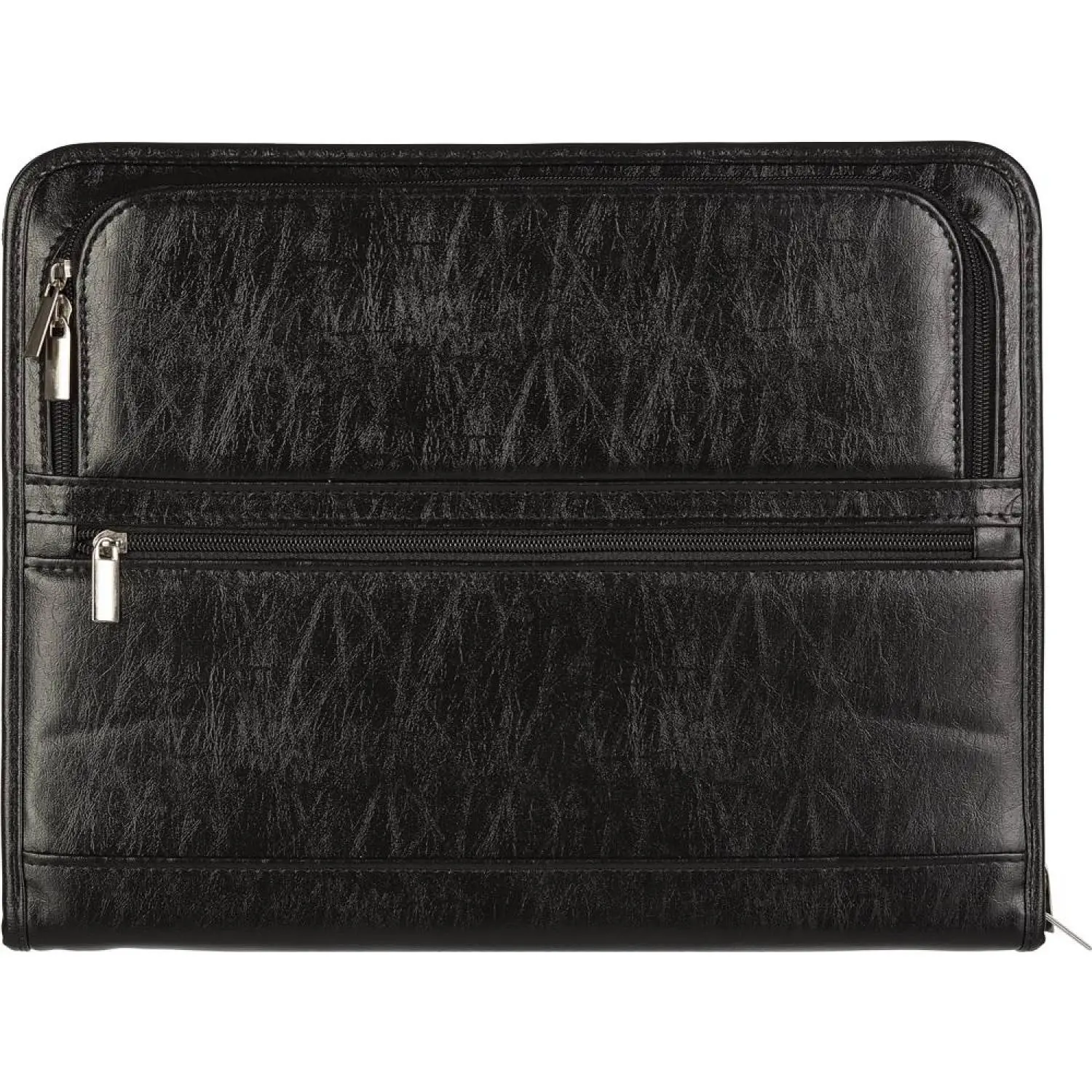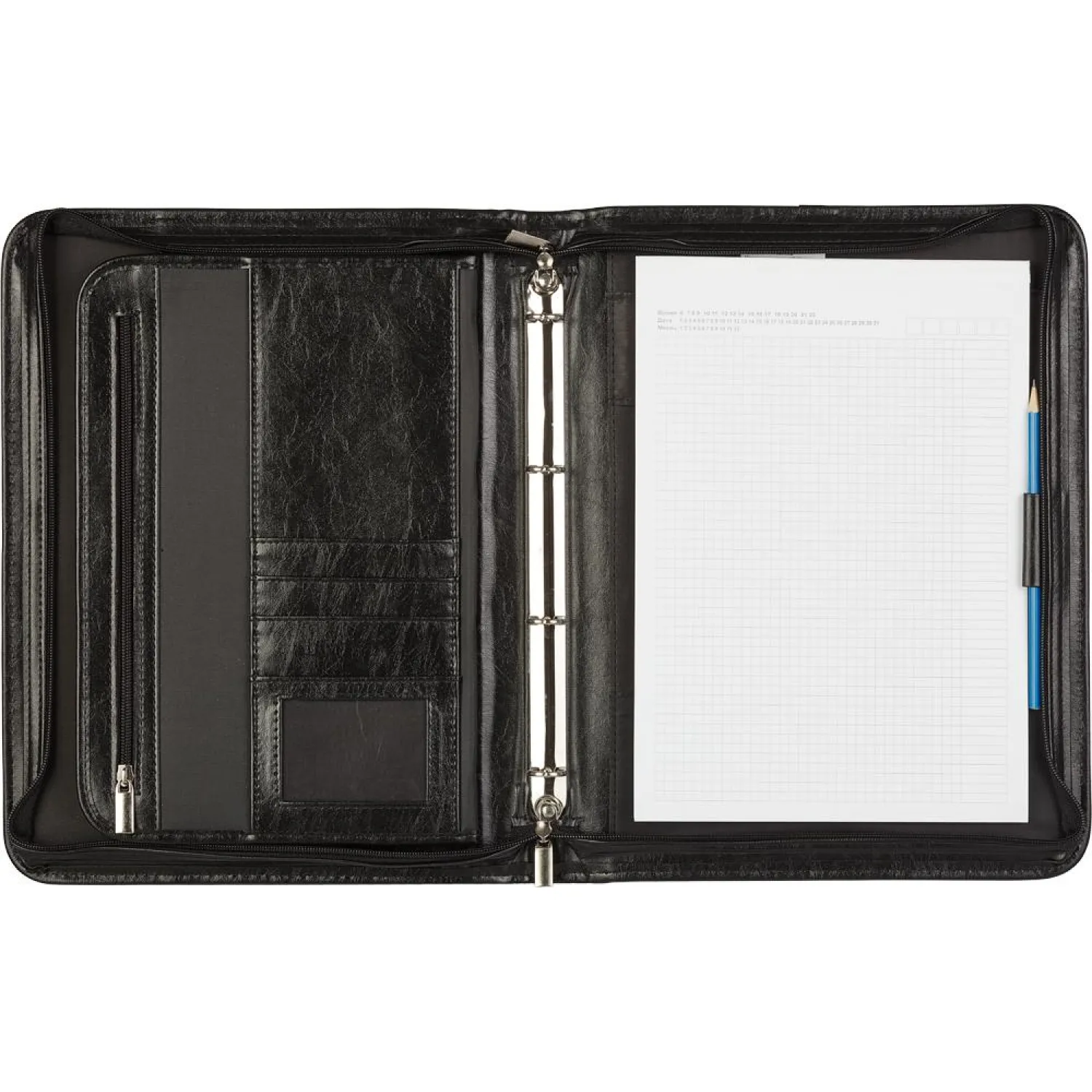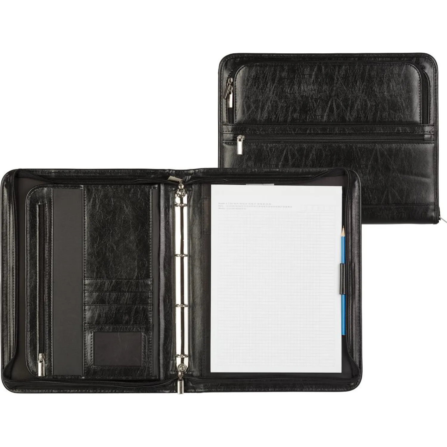 Папка из искусственной кожи № 163 с ручкой. Материал — искусственная кожа. Два внешних кармана на молнии. Объемное внутреннее отделение и система дополнительных карманов для документов разного формата. Кольцевой механизм на 4 кольца. Комплектуется отрывным блоком для записей формата А4. Размеры: 36×28 см.