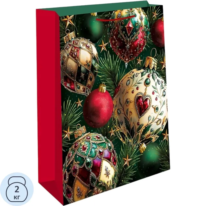 Сумка оформлена в тёмно-зелёных и бордовых тонах, подчёркивающих праздничную тематику. Прямоугольная форма и прочные петлевые ручки делают её удобной для переноски. Размер — 32×26×12 см, а прочность материала позволяет выдерживать нагрузку до 2 кг.