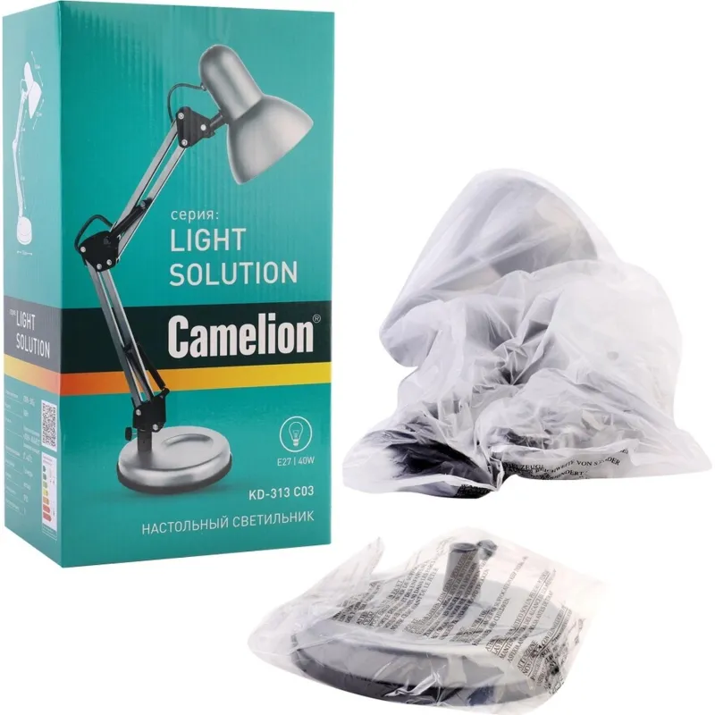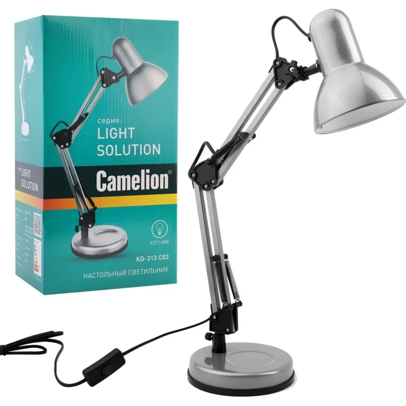 Настольные светильники «Camelion» имеют современный стильный дизайн, просты в установке и эксплуатации, изготовлены из негорючих и нетоксичных материалов и отвечают всем современным нормам комфорта и безопасности. Настольный светильник Camelion KD-313 предназначен для освещения рабочего пространства на письменном столе, создания комфортных условий на рабочем месте. Имеет интересный дизайн. В качестве источника освещения для этого могут использоваться: стандартные лампы накаливания или «миньон» галогенные лампы накаливания; компактные энергосберегающие люминесцентные лампы.
