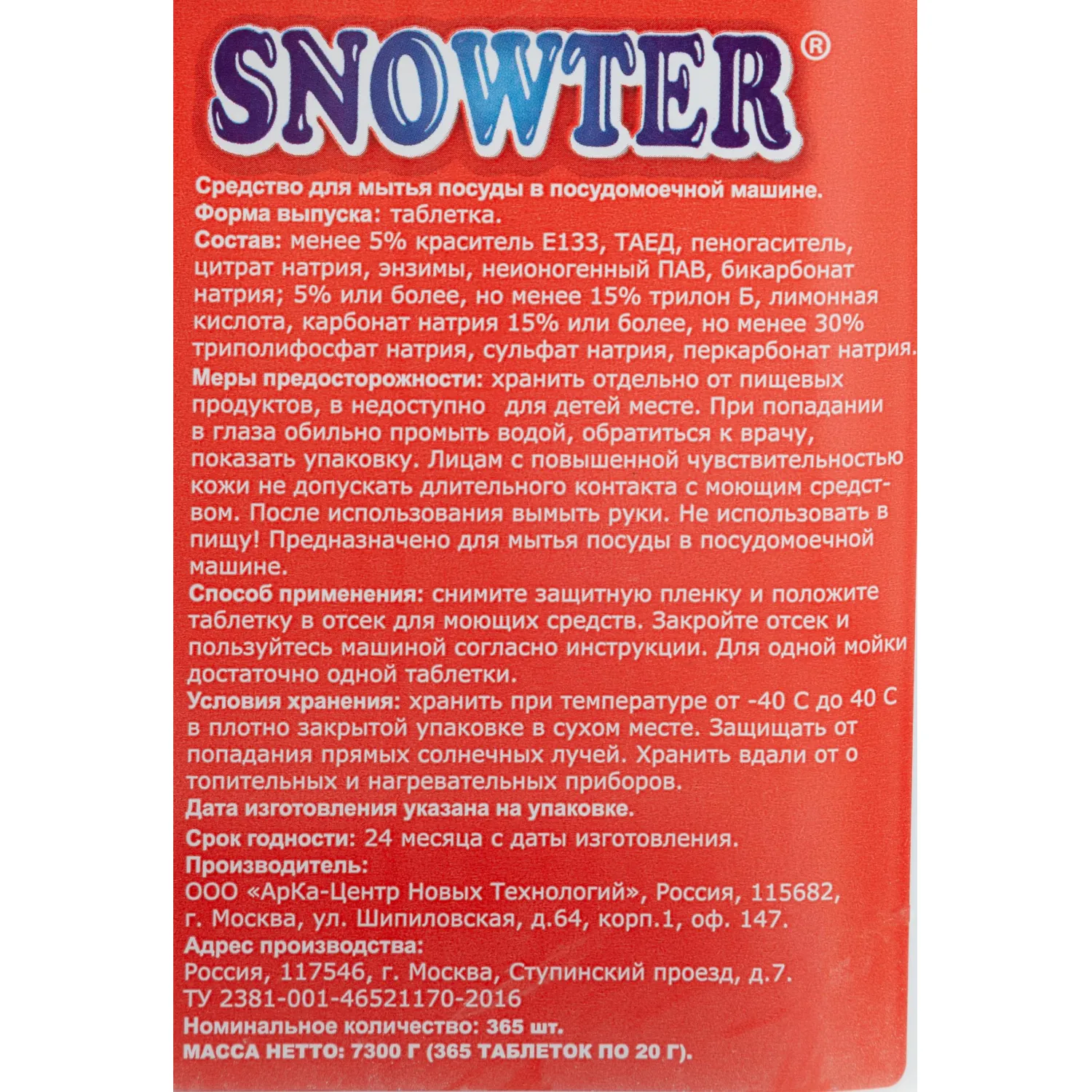 Таблетки для посудомоечных машин Snowter (365 штук в упаковке). Назначение: таблетки 5 в 1 подходят для посудомоечных машин всех типов. Способ применения: снимите защитную пленку и положите таблетку в отсек для моющих средств. Закройте отсек и пользуйтесь машиной согласно инструкции производителя. Для одной мойки достаточно одной таблетки. Меры предосторожности: избегать попадания в глаза, может вызвать раздражение. При попадании в глаза немедленно промыть большим количеством воды и обратиться к врачу. При проглатывании также немедленно обратиться к врачу и показать упаковку. Может вызвать аллергические реакции. Беречь от детей. Хранить вдали от пищевых продуктов. Не употреблять в пищу. Состав: краситель Е133 <5%, ТАЕД, пеногаситель, цитрат натрия, энзимы, неионогенный ПАВ, Бикарбонат натрия; трилон Б >5% (но <15%), лимонная кислота, карбонат натрия; триполифосфат натрия >15% (но <30%), сульфат натрия, перкарбонат натрия. Условия хранения: хранить в плотно закрытых упаковках в сухом помещении. Защищать от нагревания, влаги, попадания прямых солнечных лучей. Срок годности: 2 года с даты изготовления.