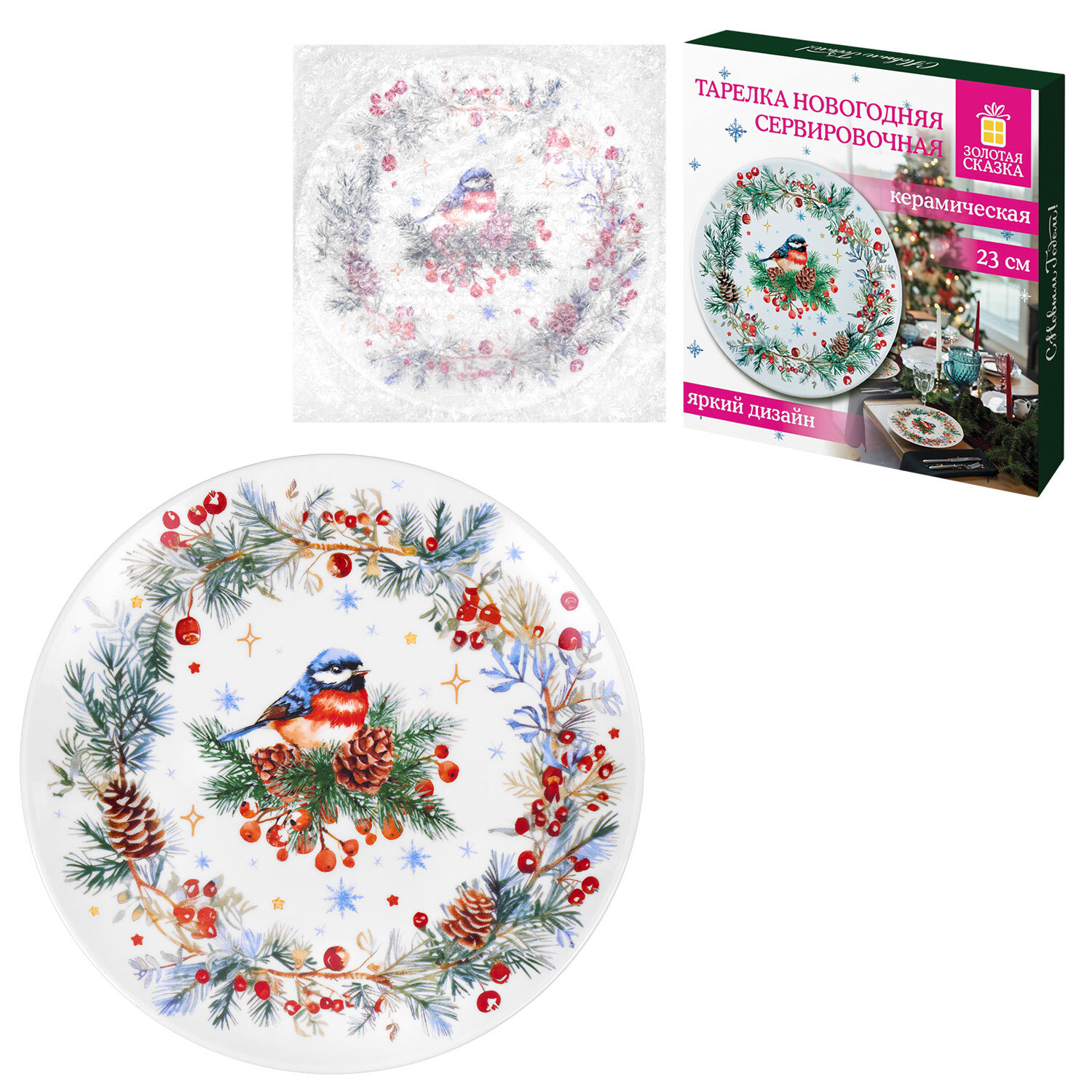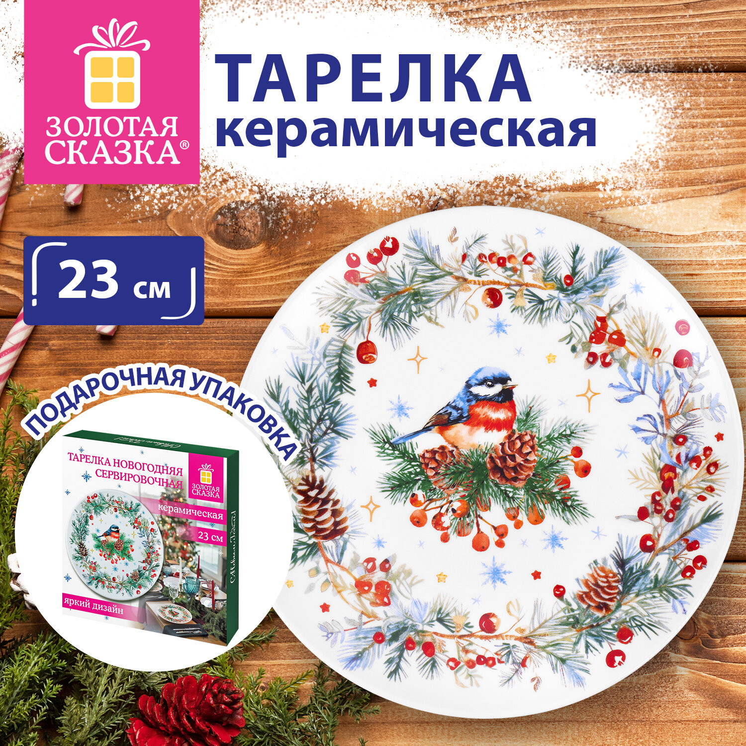 О товаре «Тарелка сервировочная новогодняя 23 см, "Снегирь", каменная керамика, ЗОЛОТАЯ СКАЗКА, 592549»