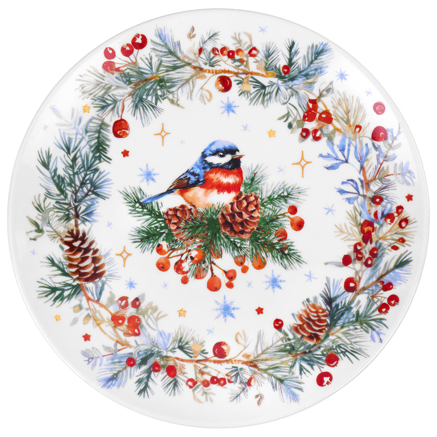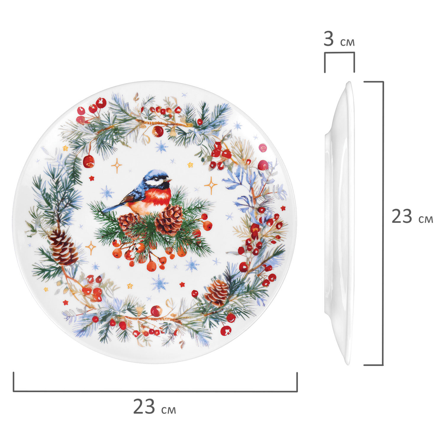 Тарелка сервировочная новогодняя 23 см, "Снегирь", каменная керамика, ЗОЛОТАЯ СКАЗКА, 592549