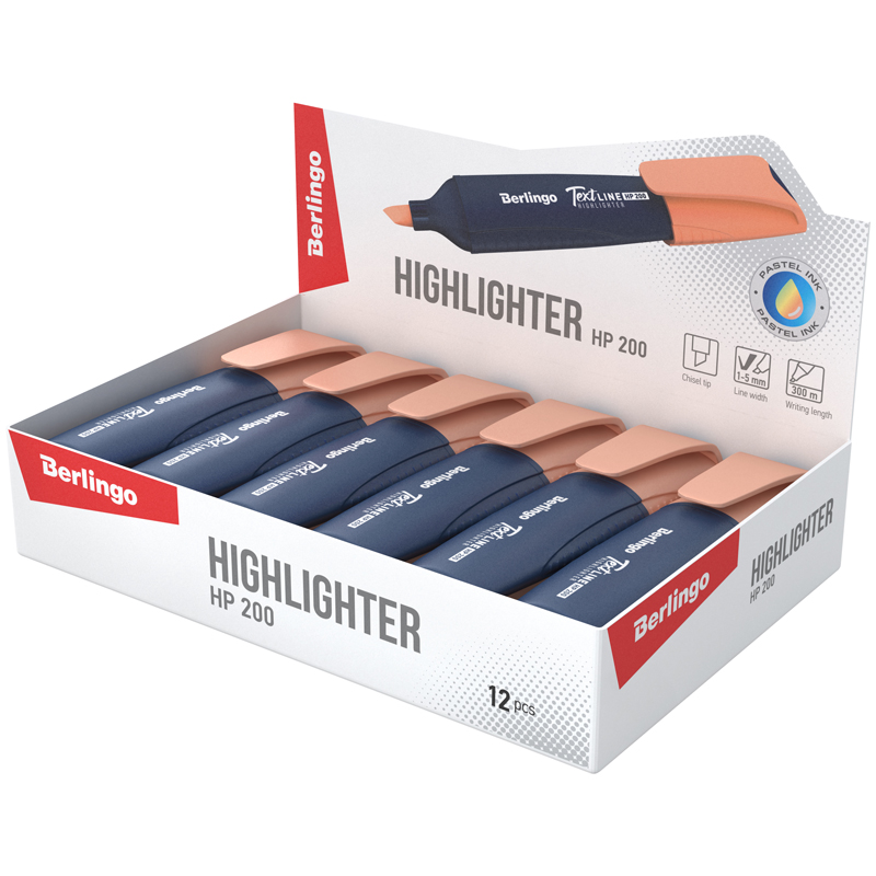 Текстовыделитель "Berlingo" предназначен для маркировки текста на всех типах бумаги. Стильный дизайн, эргономичный корпус. Колпачок в цвет чернил. Скошенный пишущий узел позволяет варьировать ширину письма от 1 до 5мм. Удобный клип. Пастельные чернила на водной основе. Упакованы в дисплей-бокс по 12 шт.