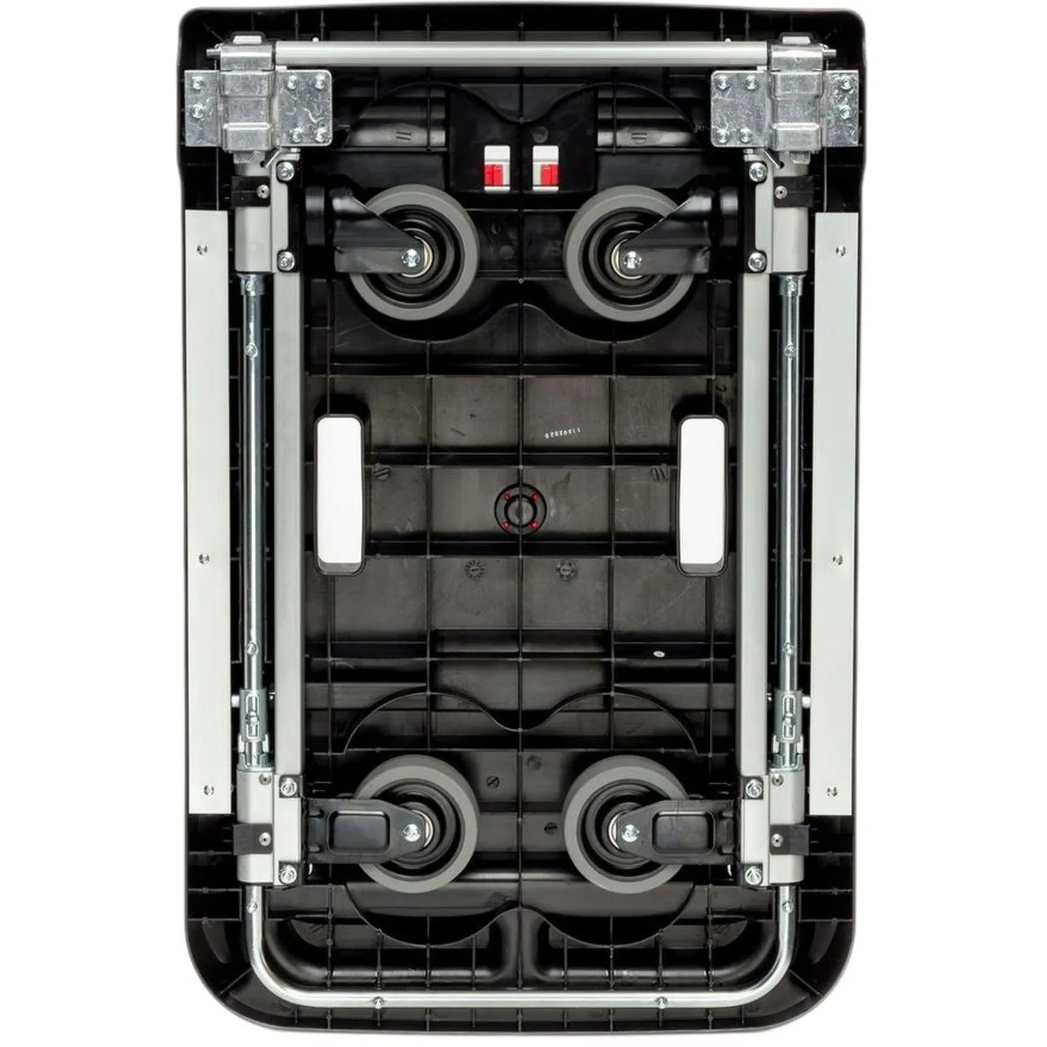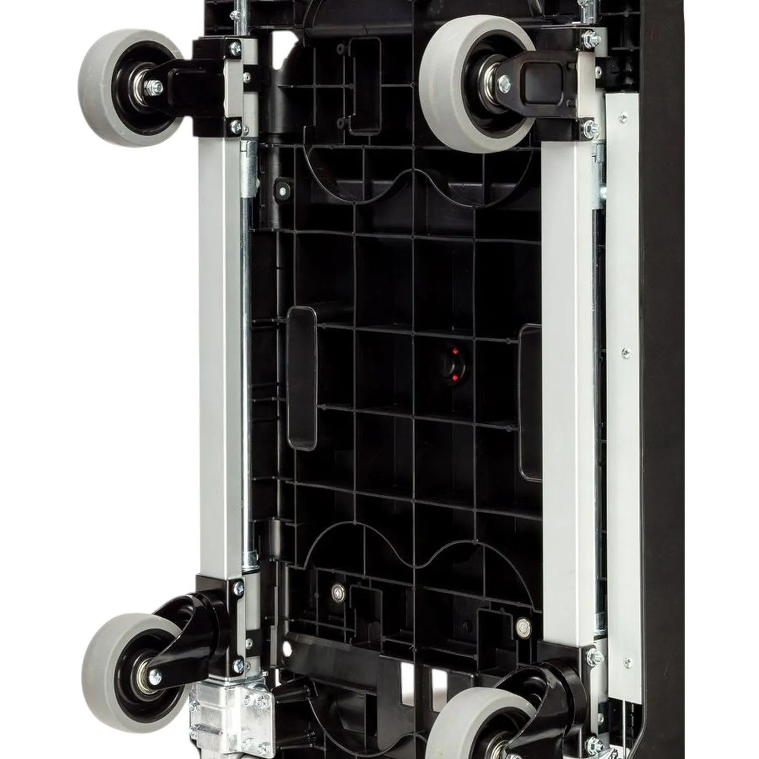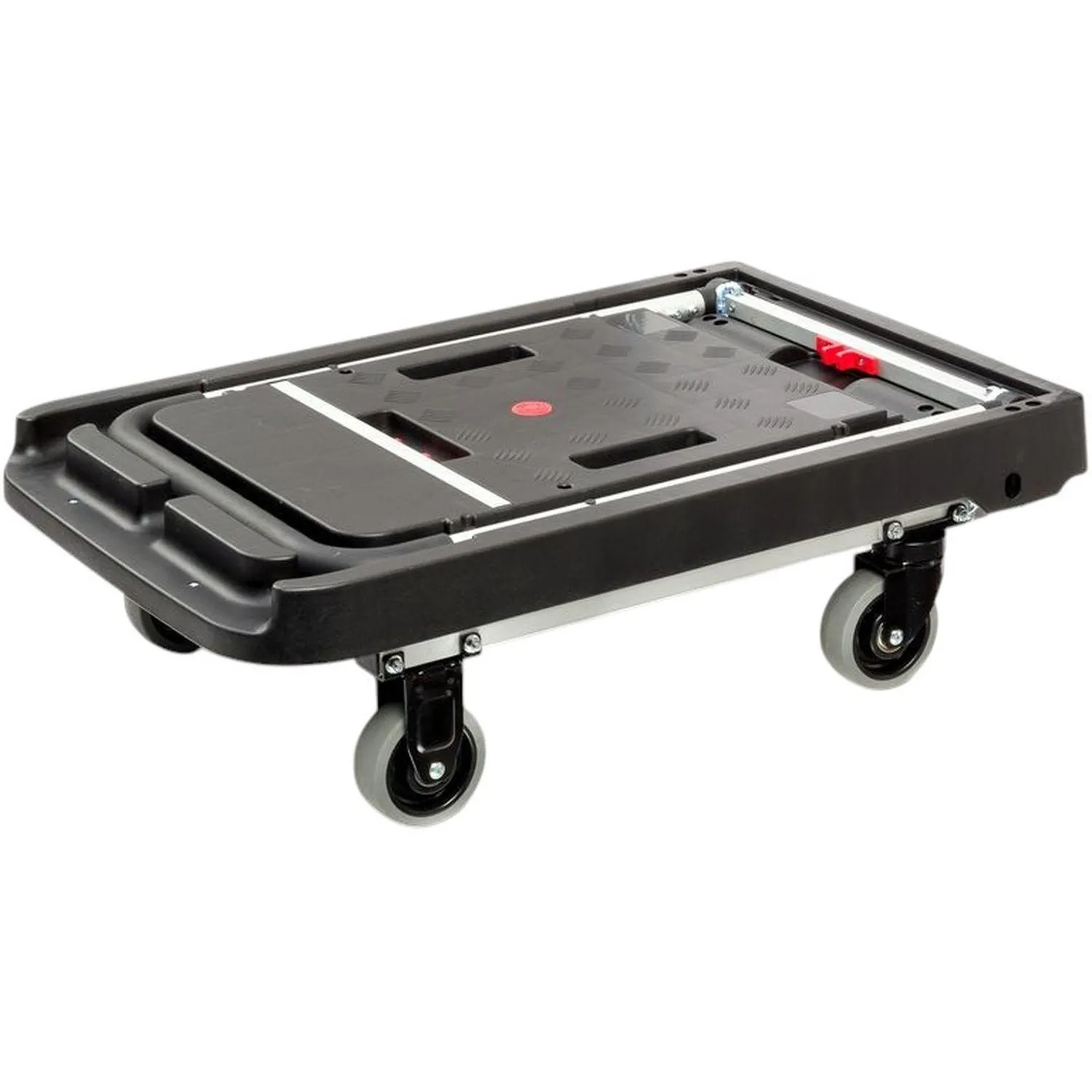 Каркас тележки изготовлен из стали и пластика, что обеспечивает прочность конструкции при эксплуатации. Платформа размером 510×495 мм подходит для размещения коробок, упаковок и других грузов. Высота от пола до платформы составляет около 135 мм, до верхней поверхности — около 235 мм, что облегчает погрузку и разгрузку. Тележка оснащена четырьмя литым колёсами с резиновым покрытием и роликовыми подшипниками, обеспечивающими плавное перемещение по различным поверхностям. Диаметр колёс составляет 125 мм, ширина — 35 мм. Конструкция включает поворотные и фиксированные кронштейны, что повышает устойчивость и манёвренность при перемещении груза.