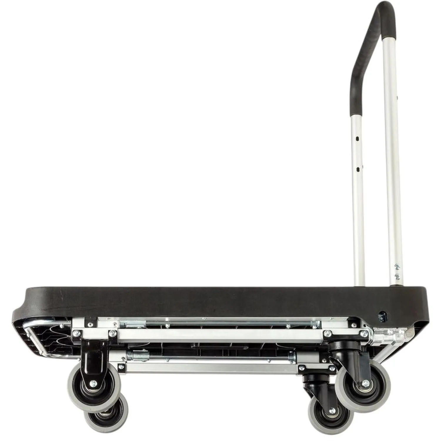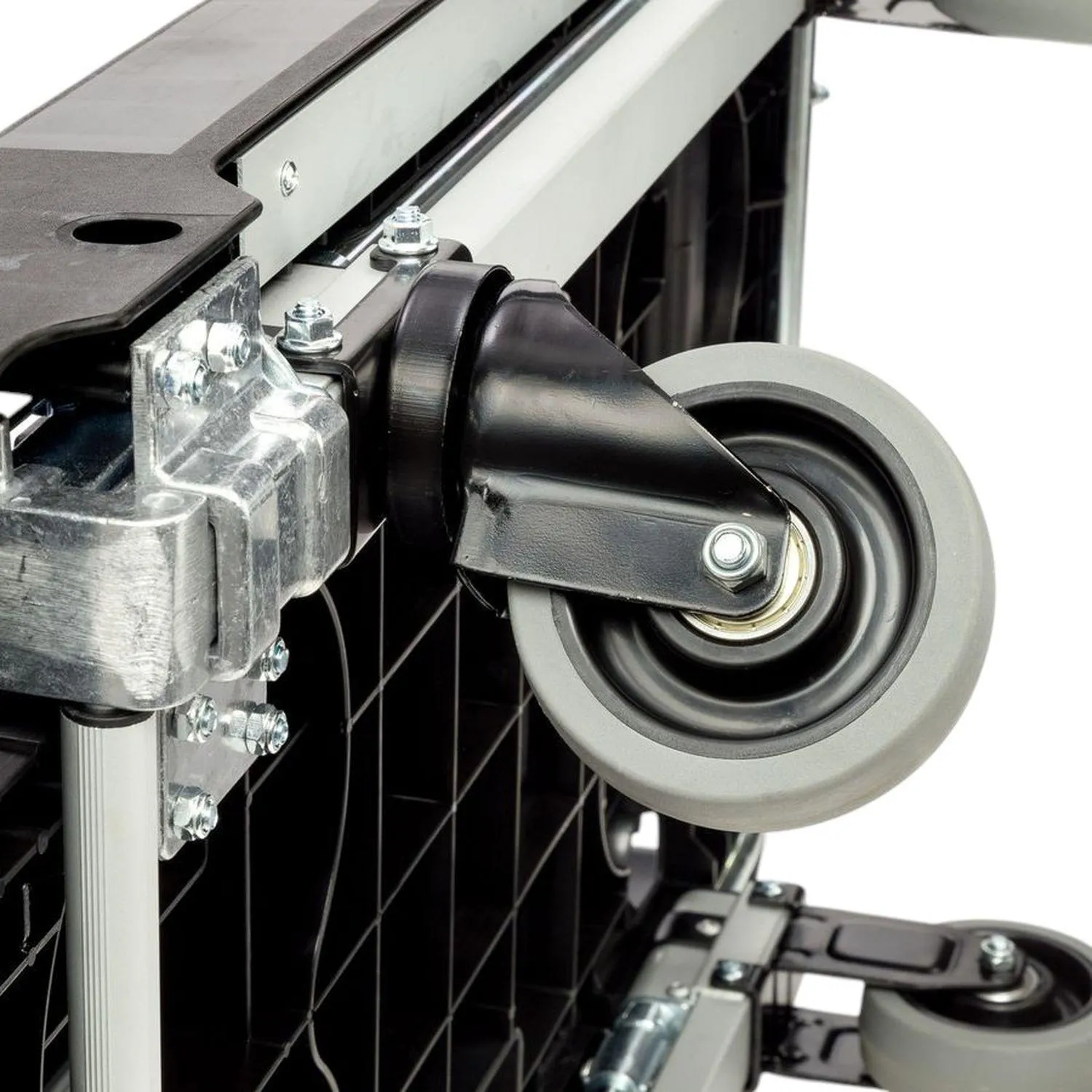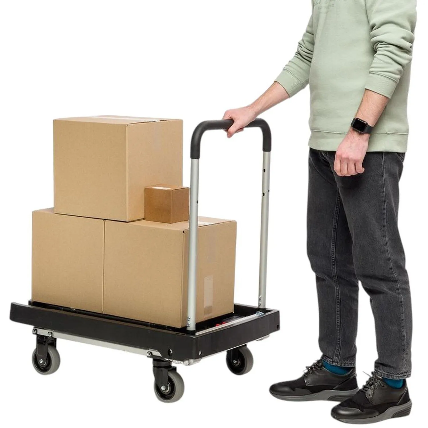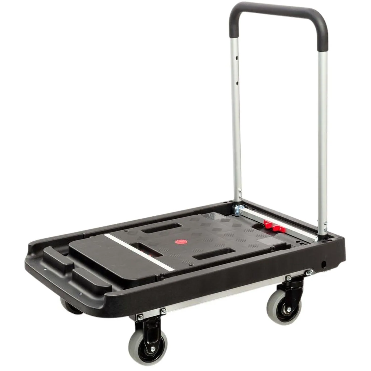 Каркас тележки изготовлен из стали и пластика, что обеспечивает прочность конструкции при эксплуатации. Платформа размером 510×495 мм подходит для размещения коробок, упаковок и других грузов. Высота от пола до платформы составляет около 135 мм, до верхней поверхности — около 235 мм, что облегчает погрузку и разгрузку. Тележка оснащена четырьмя литым колёсами с резиновым покрытием и роликовыми подшипниками, обеспечивающими плавное перемещение по различным поверхностям. Диаметр колёс составляет 125 мм, ширина — 35 мм. Конструкция включает поворотные и фиксированные кронштейны, что повышает устойчивость и манёвренность при перемещении груза.