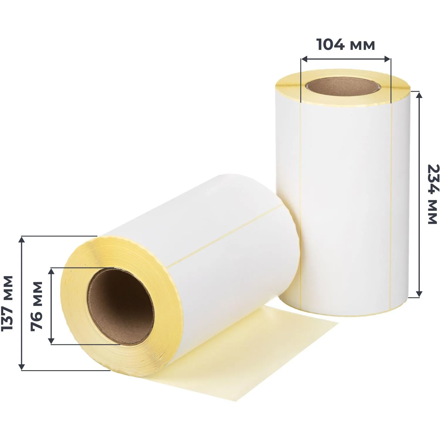 Термоэтикетки размером 234×104 мм без печати белого цвета изготовлены из материала Thermal ECO (ЭКО) ведущих производителей. Рулон с картонной втулкой диаметром 76 мм содержит 800 плюс-минус 5 этикеток.