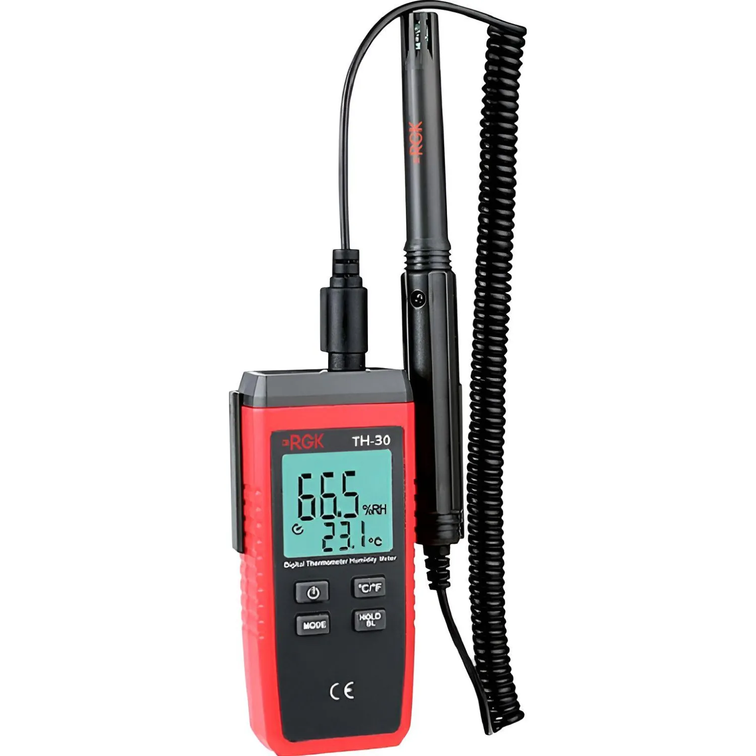 Цифровой термогигрометр Rgk TH-30 — это надежный и точный прибор для измерения климатических параметров в помещении. Главное преимущество модели — выносной датчик на длинном, гибком проводе, с помощью которого удобно проводить локальные замеры в местах с ограниченным доступом, таких, как вентиляционные каналы, технологические отверстия в стенах или плотные штабели продукции. Диапазон измерения температуры составляет -10°С — 60 °С при точности от 0.5°С, влажности — от 10% до 95% при достоверности показаний от 3%. Компактный прибор может использоваться для оценки режима хранения продукции на складах, контролю условий труда в производственных и офисных помещениях. Специалисту не требуется вручную устанавливать диапазон измерений, электронный термогигрометр Rgk TH-30 автоматически подстраивается под окружающую среду. Отображение пиковых значений вкупе с мобильностью устройства позволяет быстро оценивать параметры климата в нескольких точках больших помещений. Когда цифровой термогигрометр Rgk не используется, зонд надежно фиксируется на специальном держателе, что упрощает транспортировку и предохраняет датчик от повреждений. Прибор оснащен большим дисплеем 32×35 мм, который обеспечивает четкую визуализацию показаний. За счет встроенной подсветки результаты измерений комфортно считывать в условиях слабого или отсутствующего освещения, которые часто встречаются на складах.