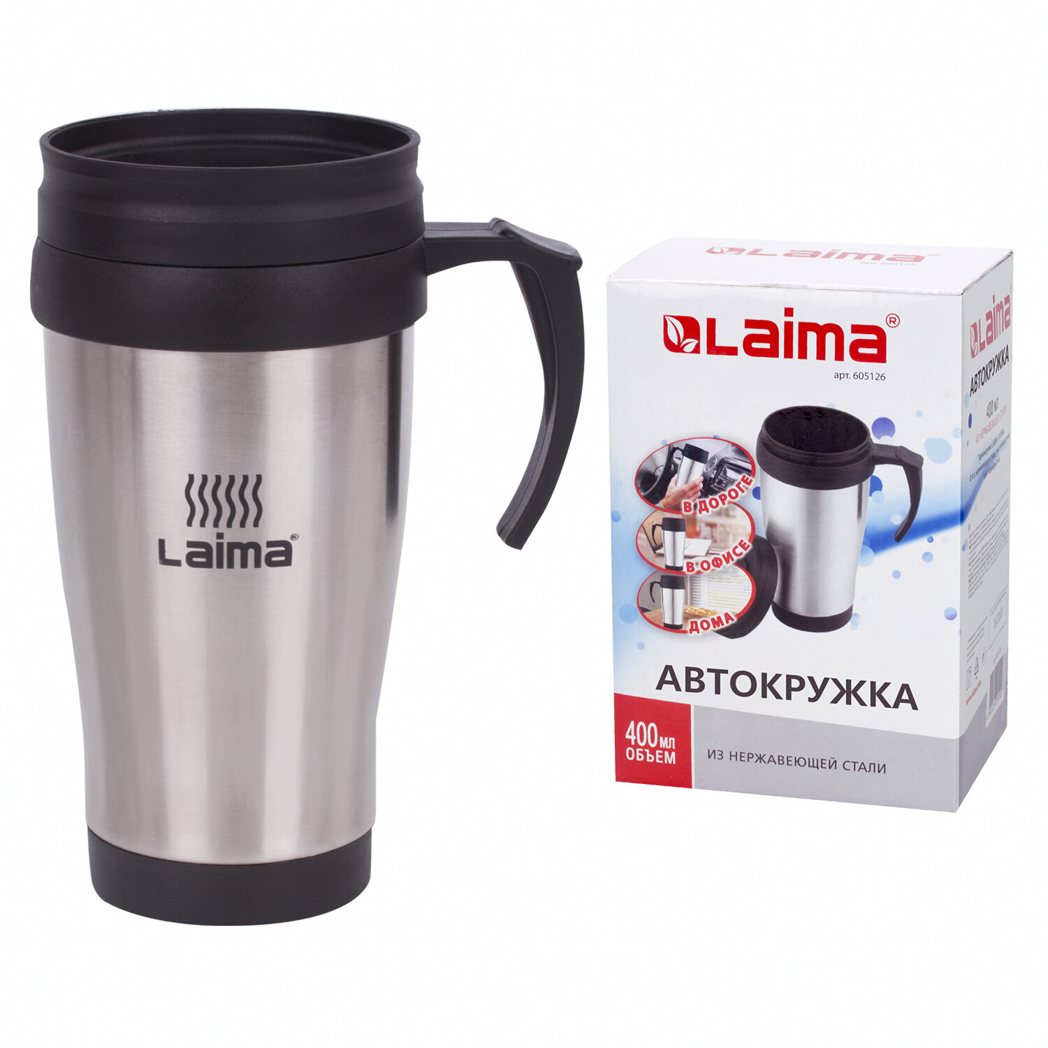 Автокружка 400 мл, термостакан с ручкой, винтовая крышка-клапан, пластик/сталь, серебро, LAIMA, 605126