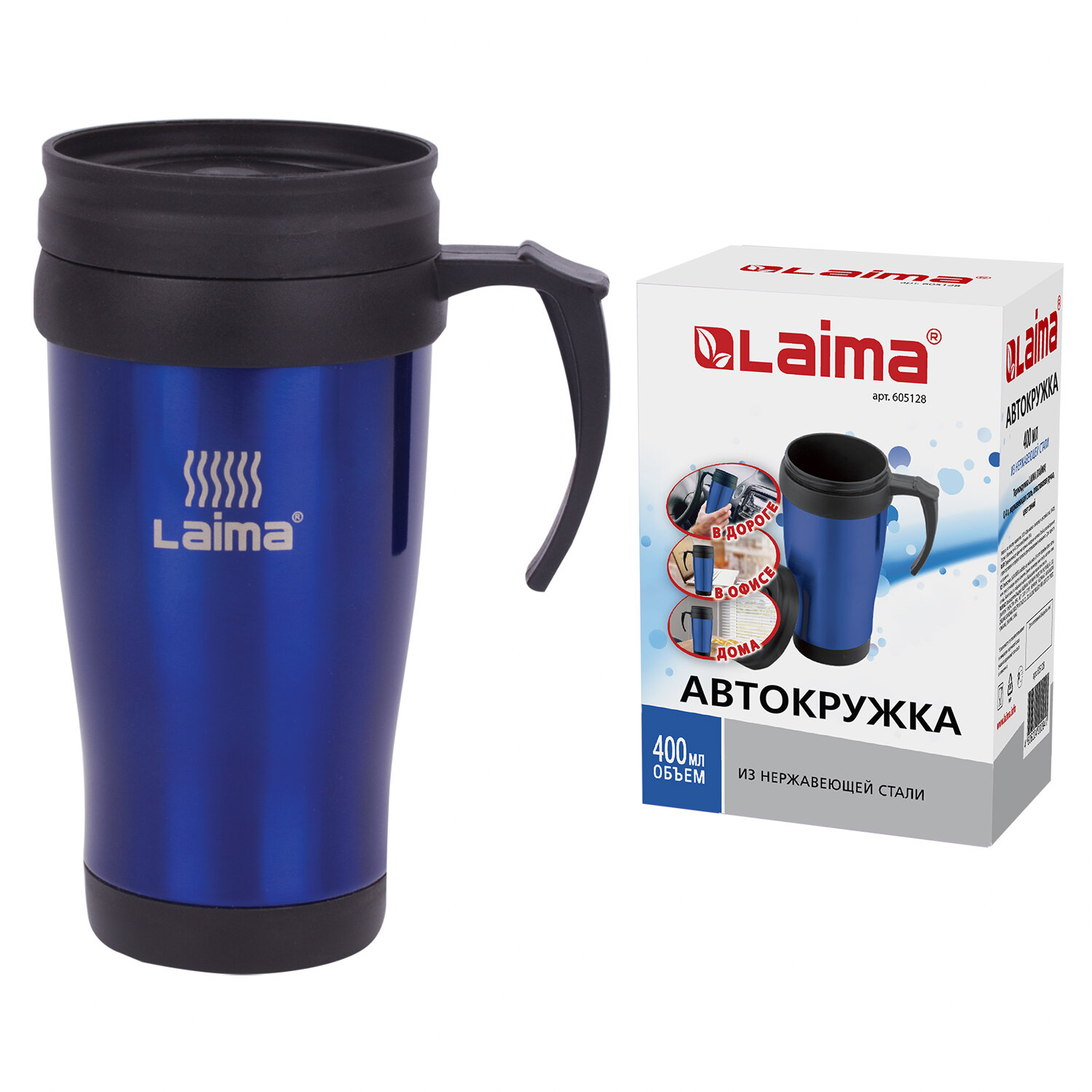 Автокружка 400 мл, термостакан с ручкой, винтовая крышка-клапан, пластик/сталь, синяя, LAIMA, 605128.