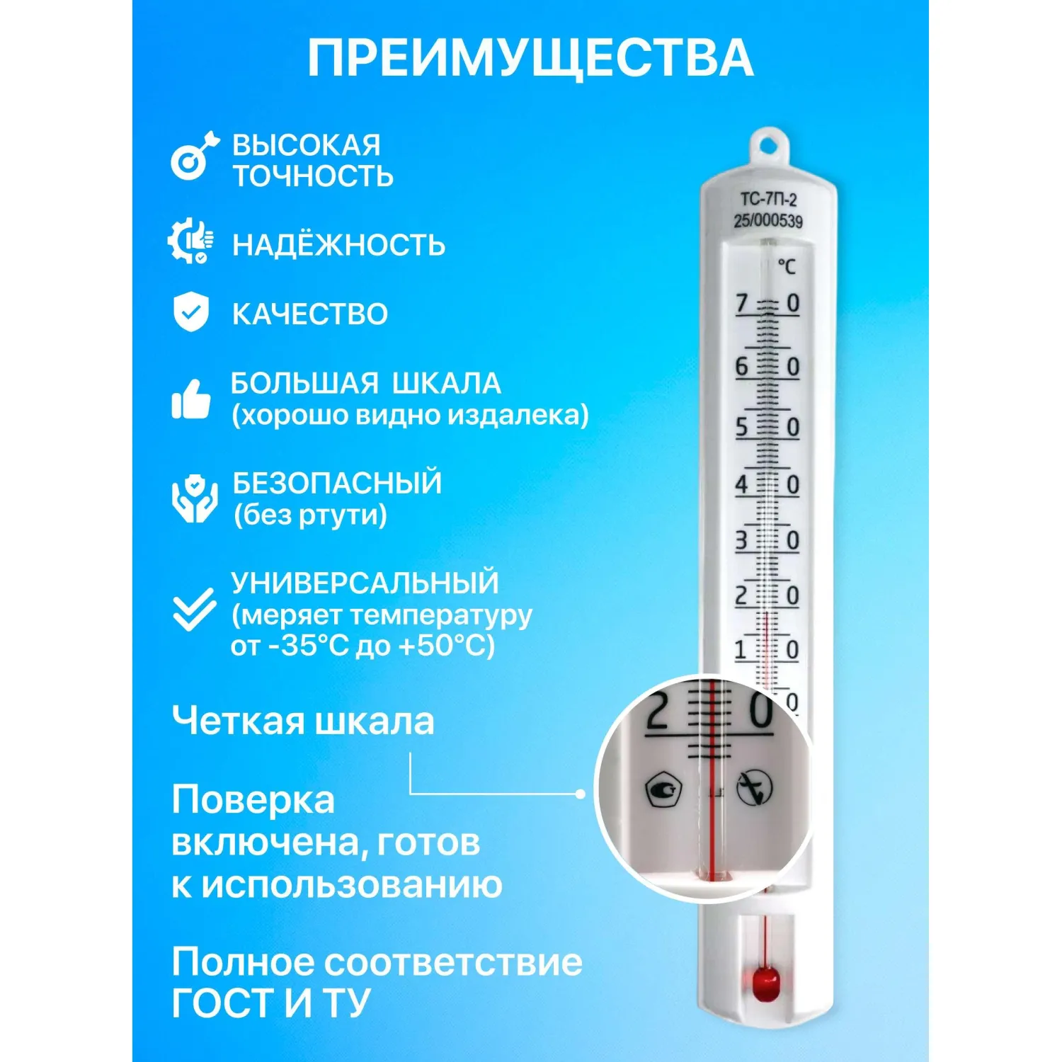 Компактный безртутный настенный жидкостный термометр имеет отверстие для крепления на стену. Межповерочный интервал — 2 года. При измерении температуры термометр должен полностью находиться в измеряемой среде. Диапазон измерений температуры от −20°C до +70°C. Цена деления шкалы термометров 1,0°C. Пределы допускаемой абсолютной погрешности измерения температуры: от −20°C до 0°C: ±1,5°C от 0°C до +70°C: ±1,0°C Измерение среды с температурой выше или ниже диапазона, указанного на шкале — не допускается.