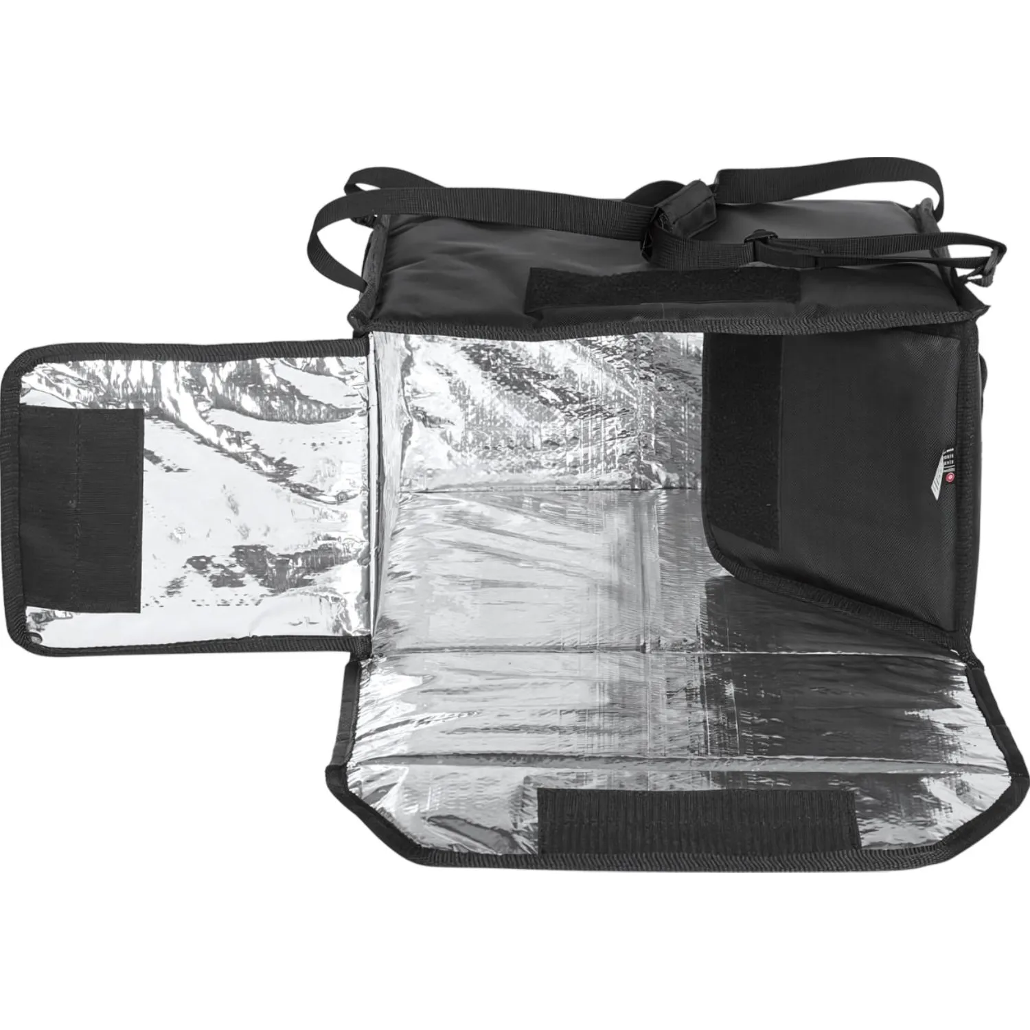Термосумка для пиццы станет незаменимым помощником в профессиональной доставке. Этот аксессуар вмещает в себя 4-5 пицц и выполнен в стильном черном цвете из ткани оксфорд, отличающейся плотным плетением, водонепроницаемостью, термоустойчивостью и износостойкостью. Внутри термосумка оснащена теплоизоляционным слоем, а снаружи — ручками для комфортного переноса пиццы на дальние расстояния. Сумка герметично закрывается с помощью застежки-липучки. Снаружи также имеется карман с прозрачным пластиковым окошком, в котором можно размещать распечатанные документы на заказ, флаеры и прочую рекламную полиграфию компании-доставщика. По запросу возможно нанесение на сумку логотипа компании и дополнительная комплектация внутренней перегородкой. Размер термосумки: 36×36×25 см. Максимальное количество пицц: 4-5 штук. Страна происхождения: Россия.