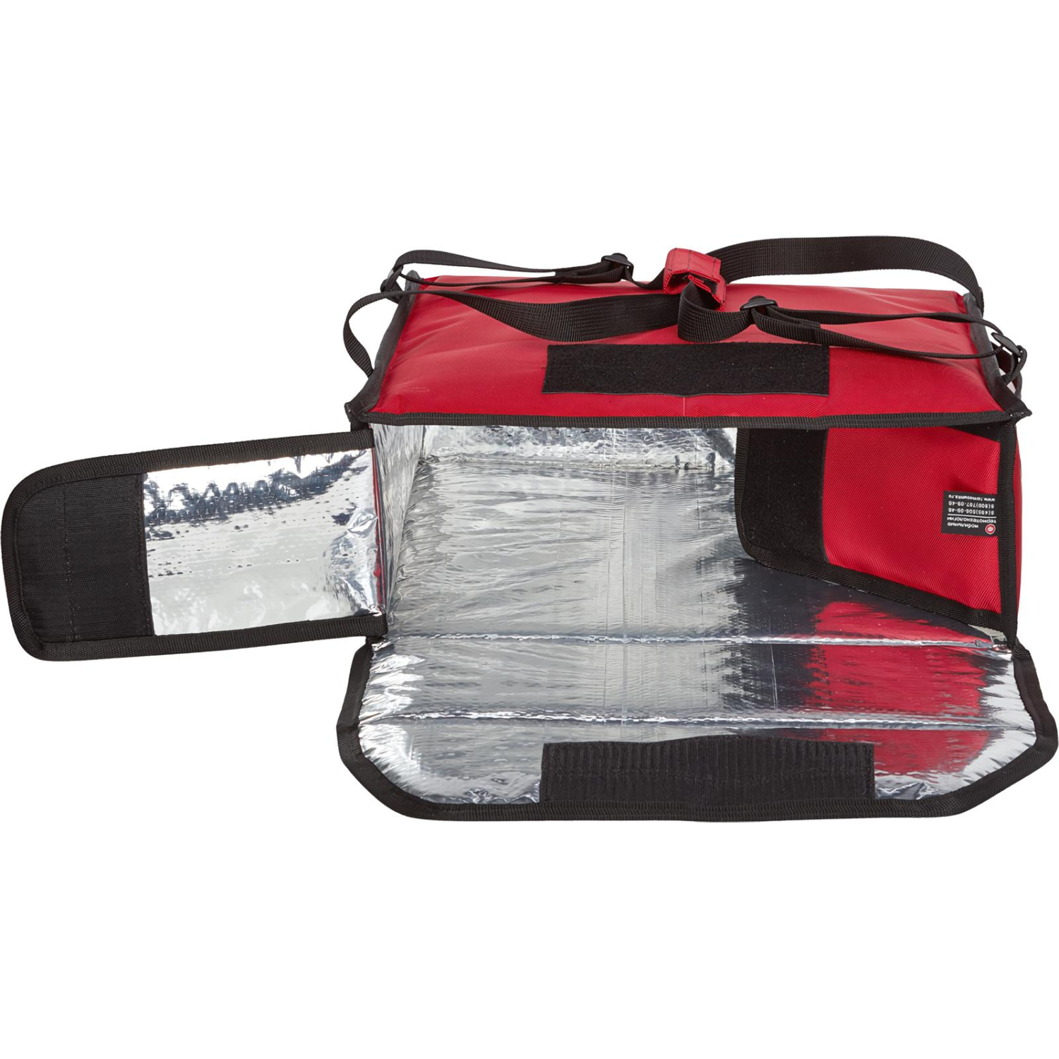 Термосумка для пиццы станет незаменимым помощником в профессиональной доставке. Этот аксессуар вмещает в себя 3 пиццы и выполнен в стильном красном цвете из ткани оксфорд, отличающейся плотным плетением, водонепроницаемостью, термоустойчивостью и износостойкостью. Внутри термосумка оснащена теплоизоляционным слоем, а снаружи — ручками для комфортного переноса пиццы на дальние расстояния. Сумка герметично закрывается с помощью застежки-липучки. Снаружи также имеется карман с прозрачным пластиковым окошком, в котором можно размещать распечатанные документы на заказ, флаеры и прочую рекламную полиграфию компании-доставщика. По запросу возможно нанесение на сумку логотипа компании и дополнительная комплектация внутренней перегородкой. Размер термосумки: 42×42×15 см. Максимальное количество пицц: 3 штуки. Страна происхождения: Россия.