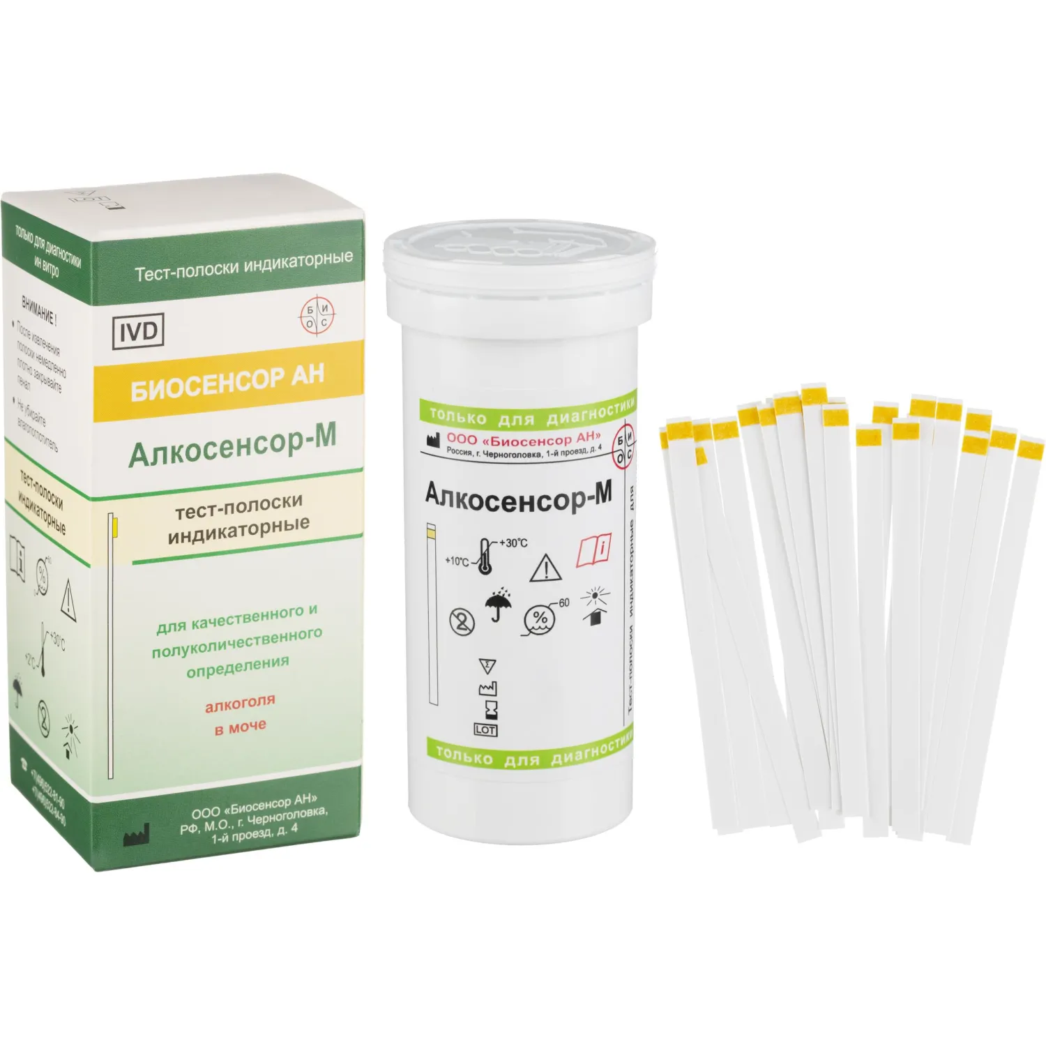 Полоски индикаторные Алкосенсор-М предназначены для качественного и полуколичественного определения алкоголя в моче (для экспресс-анализа диагностики in vitro). Качественное и полуколичественное определение алкоголя в моче используется в качестве вспомогательного метода, для контроля концентрации алкоголя в моче человека, скрининга и мониторинга состояния алкогольного опьянения, эффективности процедуры дезинтоксикации организма человека.