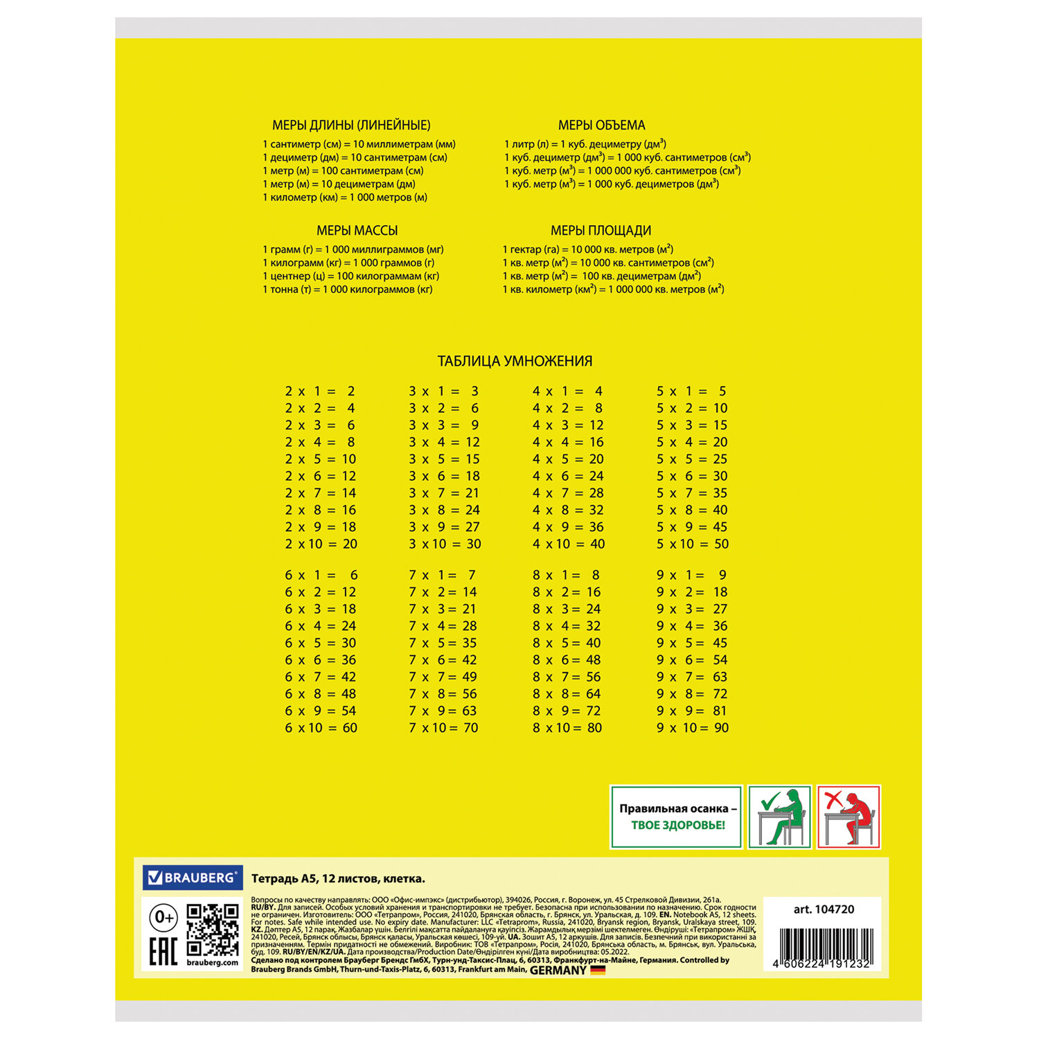 О товаре «Тетрадь 12 л. BRAUBERG КЛАССИКА, клетка, обложка картон, ЖЕЛТАЯ, 104720»
