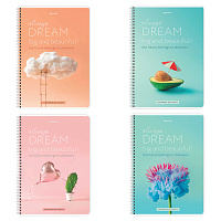 Внутренний блок содержит 80 листов офсетной бумаги плотностью 60 г/м2. Обложка изготовлена из мелованного картона и покрыта глянцевым лаком. Линовка – клетка. Гребень надежно скрепляет листы между собой. Белизна – 92%. Формат А4.
