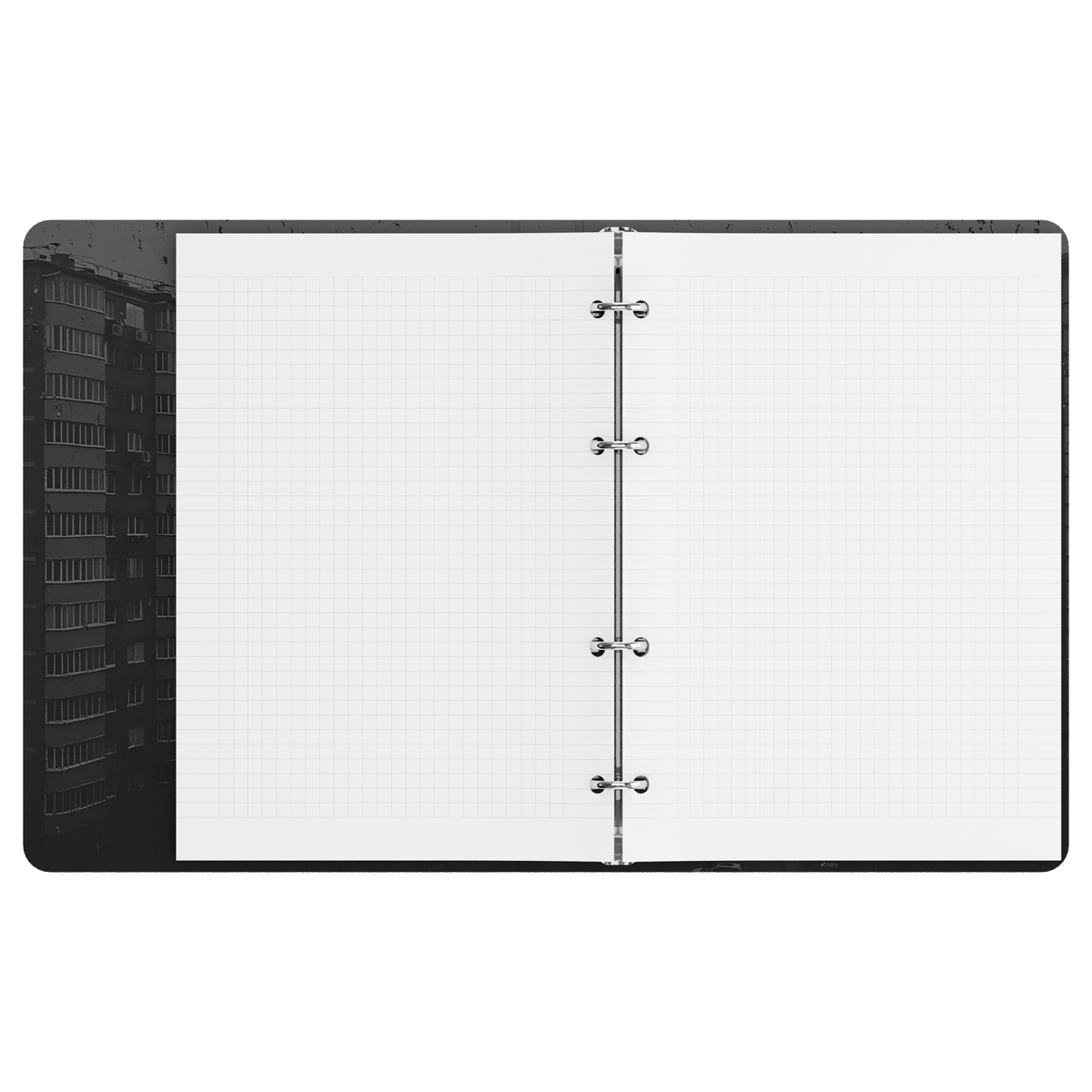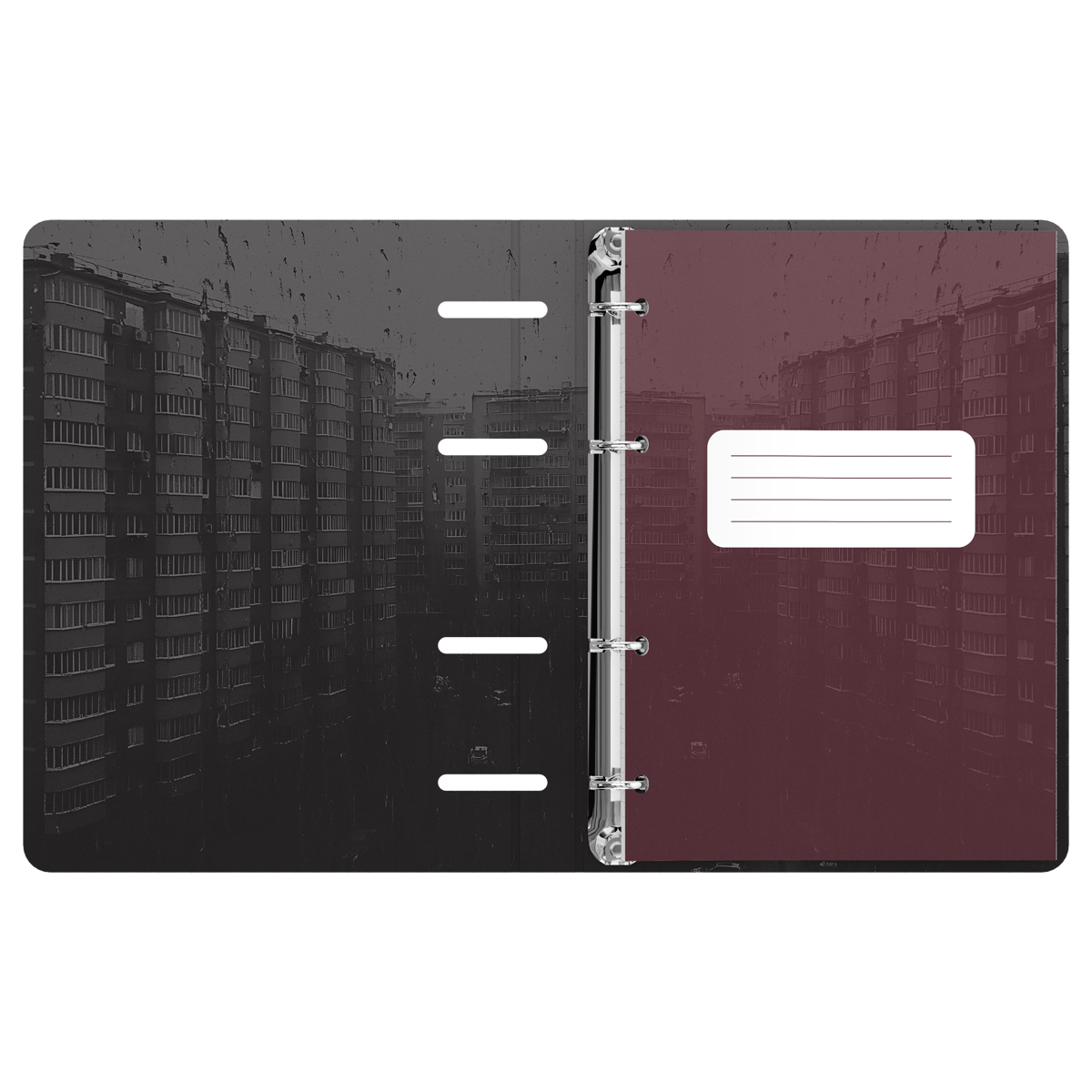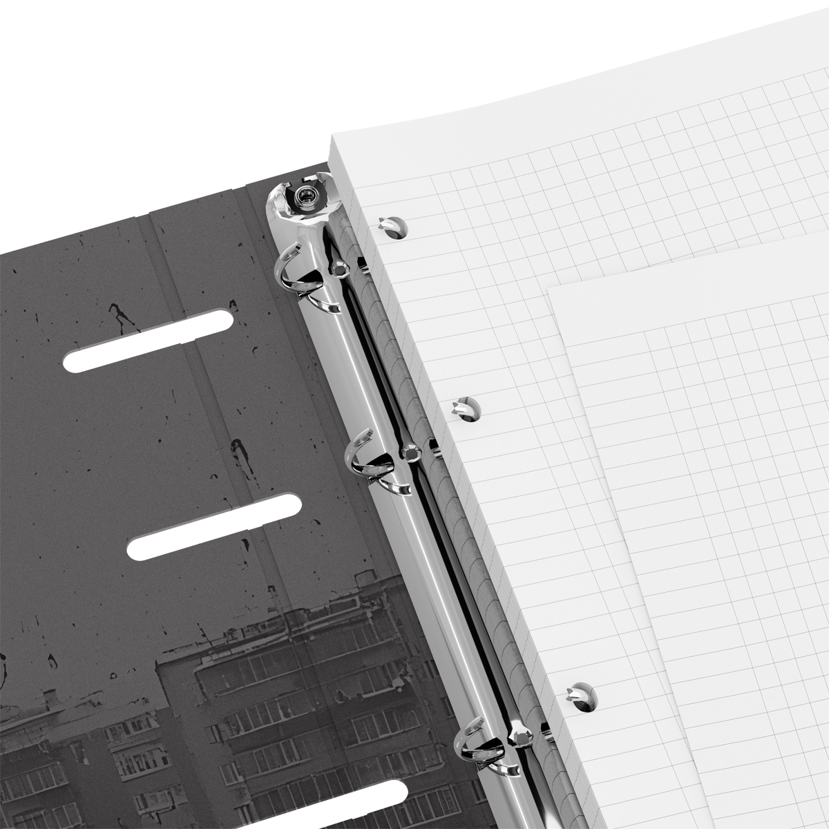 Механизм из 4 колец обеспечивает быструю смену или добавление листов при необходимости. Обложка сделана из плотного картона, который надёжно защищает внутренний блок. Отделка обложки — матовая ламинация. Тетрадь упакована в картон и индивидуальный пакет.