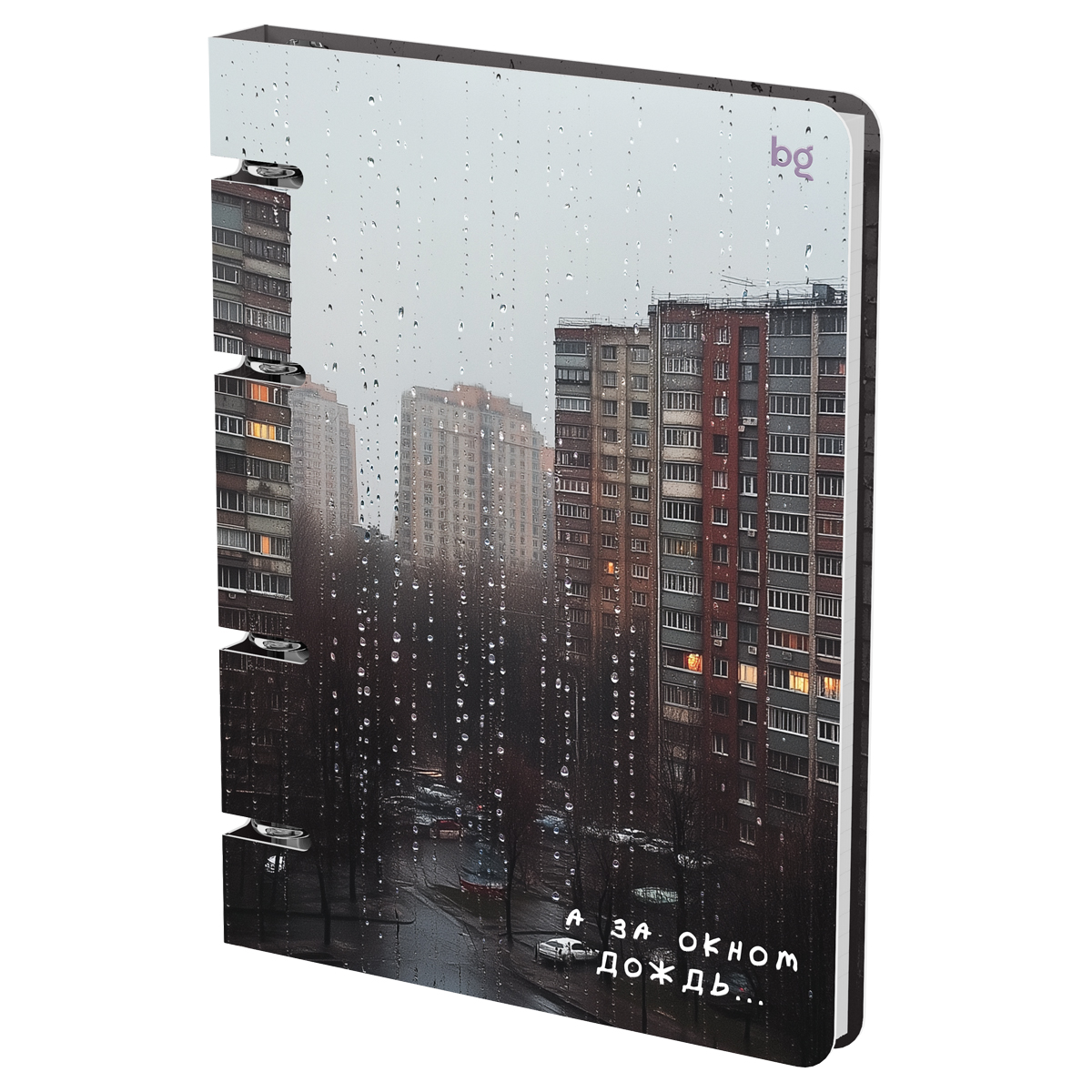 Тетрадь на кольцах BG «За окном» формата А5 подходит для большого объёма записей. Эффектный дизайн обложки и форзаца поднимет настроение на учёбе или работе. Размер — 160*212 мм. Внутренний блок состоит из 120 белых листов с линовкой в клетку. Плотность офсетной бумаги — 60-65 г/м2. Белизна — 100%.