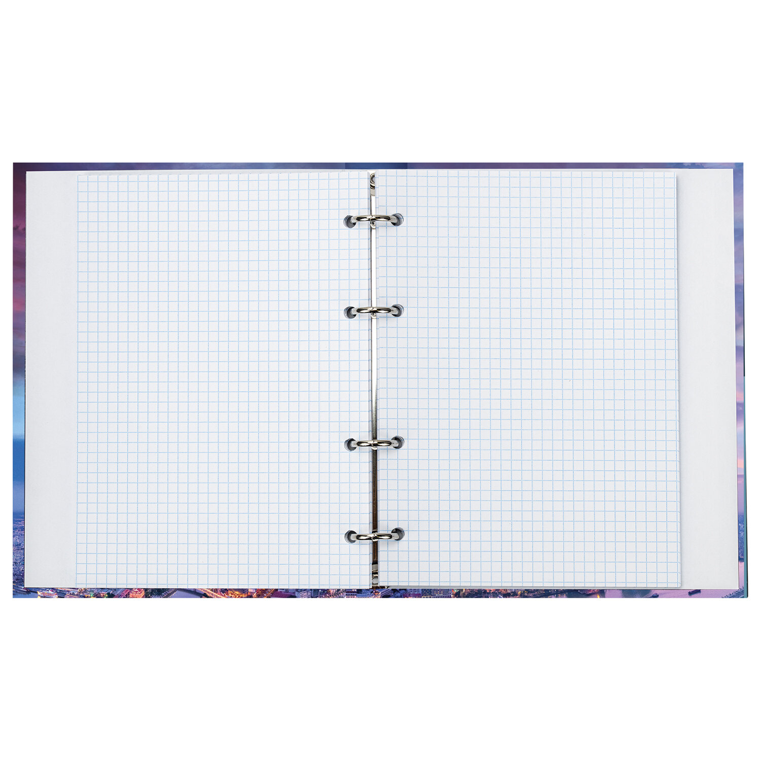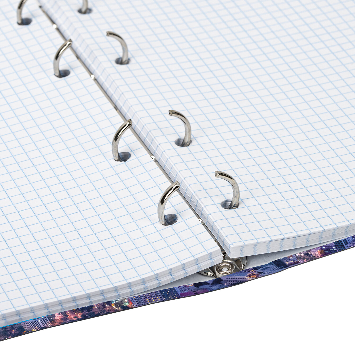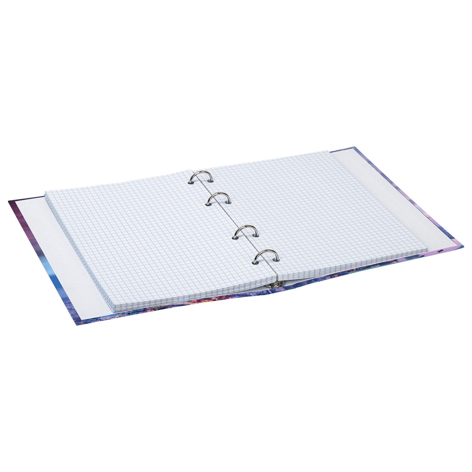 Блок состоит из 120 листов офсетной бумаги белого цвета плотностью 60 г/м2. Линовка – клетка. Жесткая книжная обложка выполнена из яркого переплетного картона и покрыта глянцевой пленкой. Формат А5 является стандартным и обеспечивает комфортное ношение в рюкзаке/ранце или папке. Оборудована кольцевым механизмом с 4-мя кольцами для подшивки сменных блоков, что позволит носить на учебу/работу всего одну тетрадь с возможностью добавлять и менять листы. Диаметр колец составляет 20 мм.