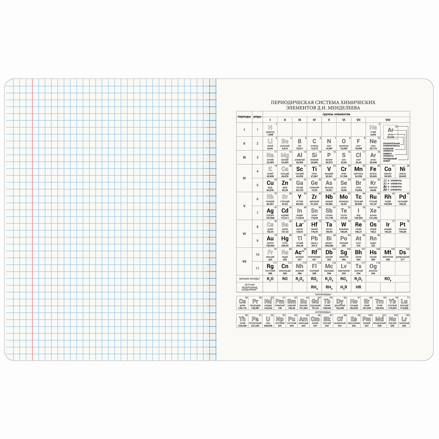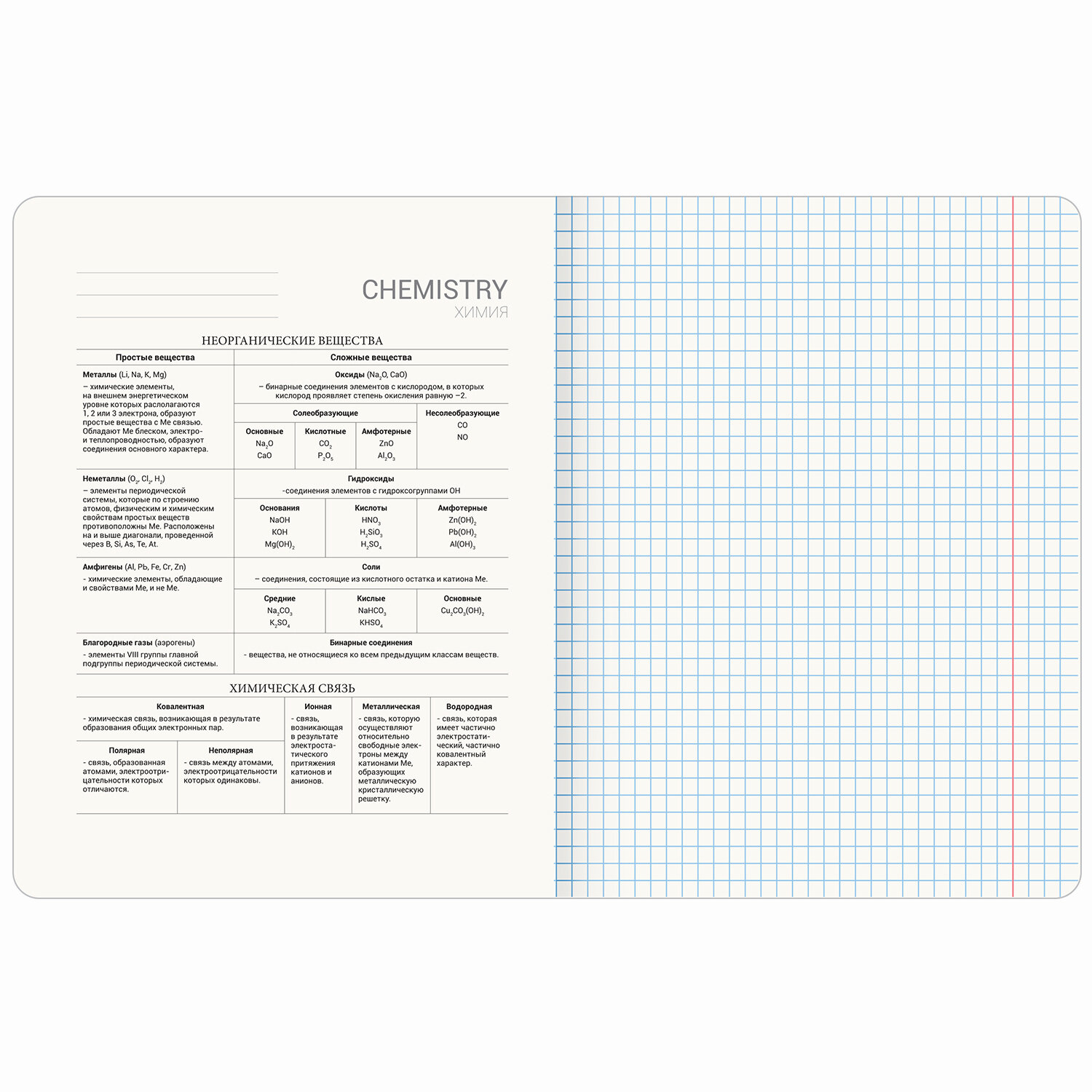 Тетрадь "Химия" формата А5 (165х202 мм) содержит 48 листов, изготовленных из высококачественной офсетной бумаги плотностью 65 г/м2 и белизной 100%. Листы соединены скобами. Линовка блока - в клетку, поля красные. Обложка выполнена из мелованного картона плотностью 190 г/м2 в тематике соответствующего предмета. Ламинация SoftTouch с тиснением фольгой обеспечивает обложке мягкий, бархатистый тактильный эффект. Углы тетради скруглены. В справочном материале собраны основные подсказки по школьному предмету для учащихся.