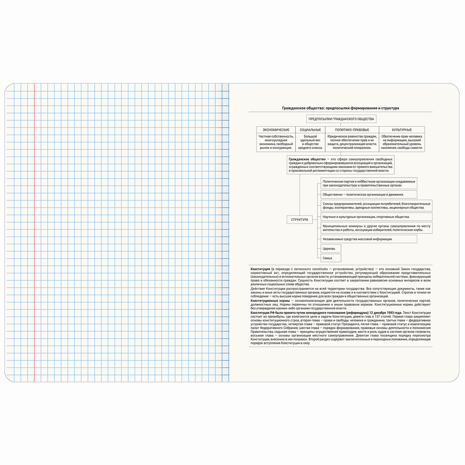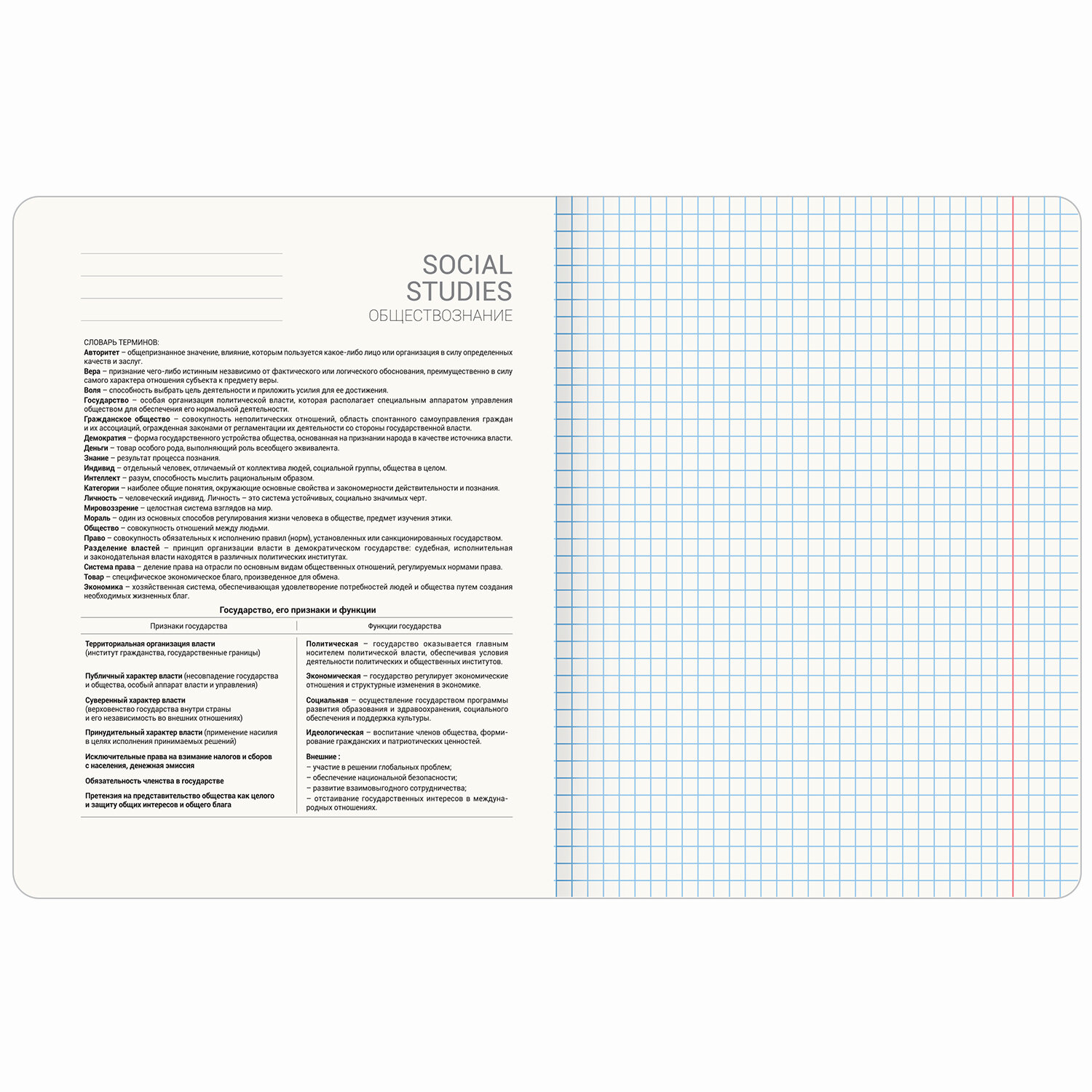 Тетрадь "Обществознание" формата А5 (165х202 мм) содержит 48 листов, изготовленных из высококачественной офсетной бумаги плотностью 65 г/м2 и белизной 100%. Листы соединены скобами. Линовка блока - в клетку, поля красные. Обложка выполнена из мелованного картона плотностью 190 г/м2 в тематике соответствующего предмета. Ламинация SoftTouch с тиснением фольгой обеспечивает обложке мягкий, бархатистый тактильный эффект. Углы тетради скруглены. В справочном материале собраны основные подсказки по школьному предмету для учащихся.