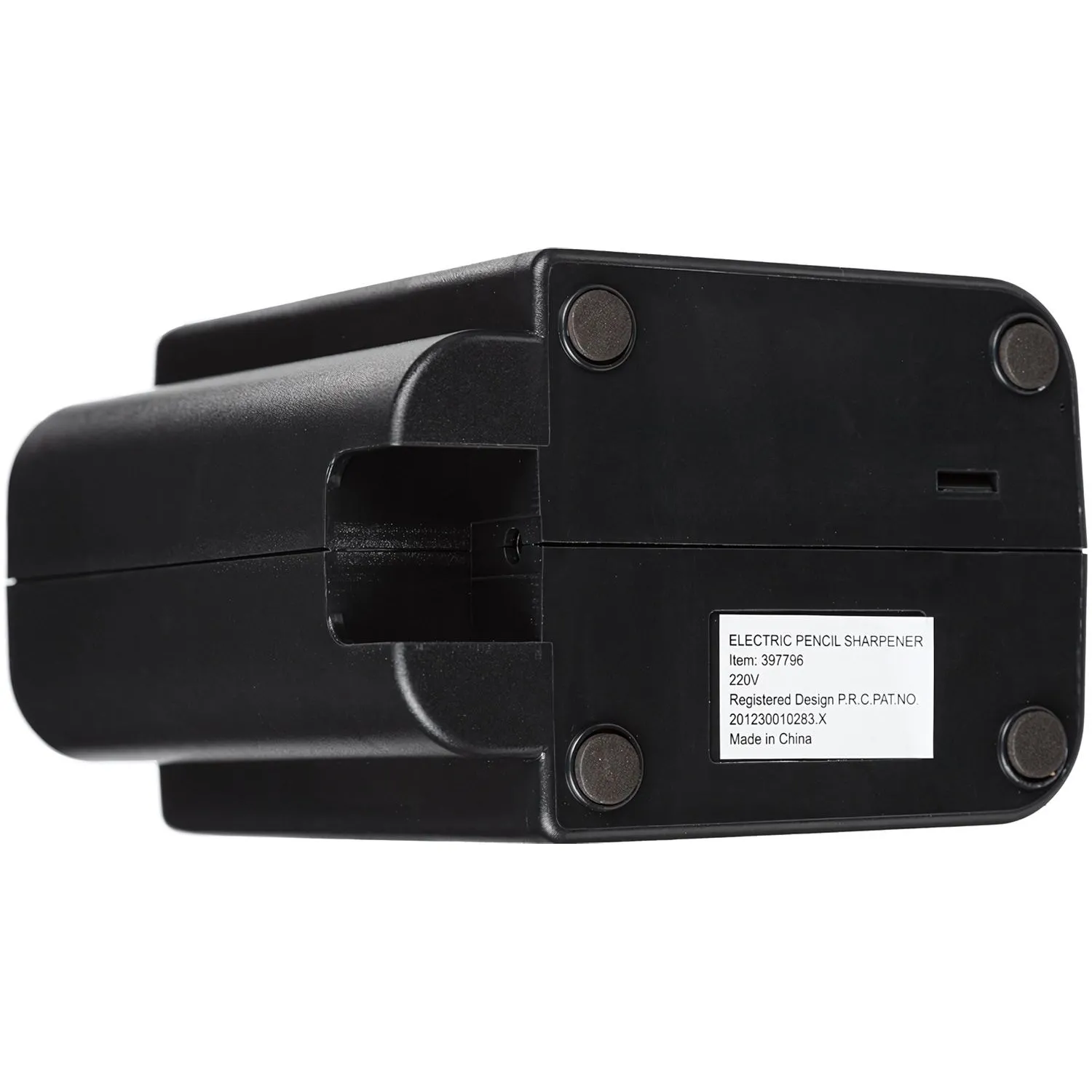 Точилка электрическая c одним отверстием. Изготовлена из пластика черного и белого цвета. Работает от сети 100-120/220-240В. Оснащена большим контейнером для стружки и отделением для карандашей. Предназначена для заточки карандашей диаметром 6,5-8 мм. Автоматическое включение/выключение. В комплект входит АС/DС-адаптер (100-240В). Длина шнура — 152 см. Гарантия 12 месяцев. Размер точилки: 111×77×140 мм. Размер контейнера: 65×45×90 мм. Размер блока питания: 70×40×75 мм. Рекомендовано для использования в дошкольных и школьных учреждениях, а также дома и в офисе.