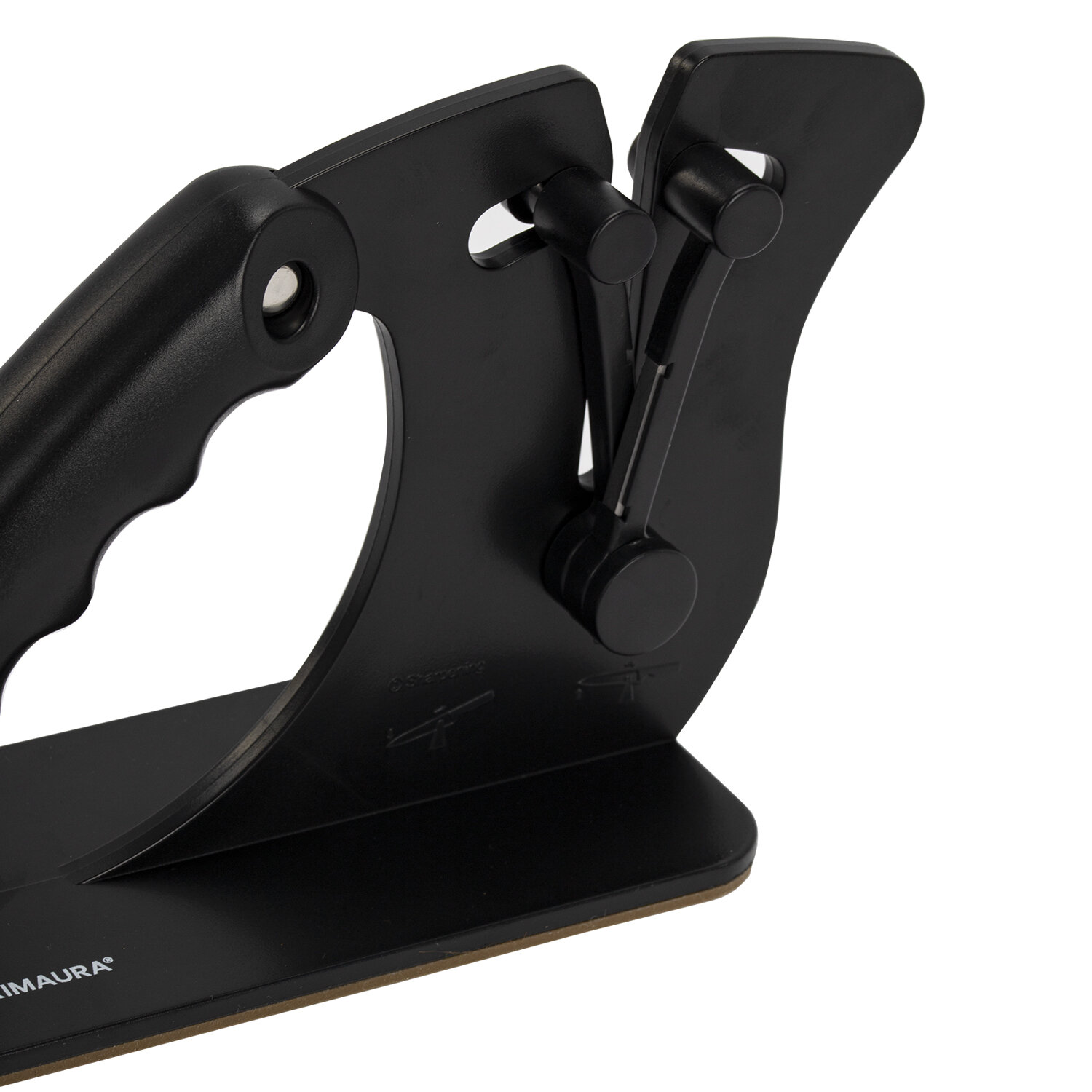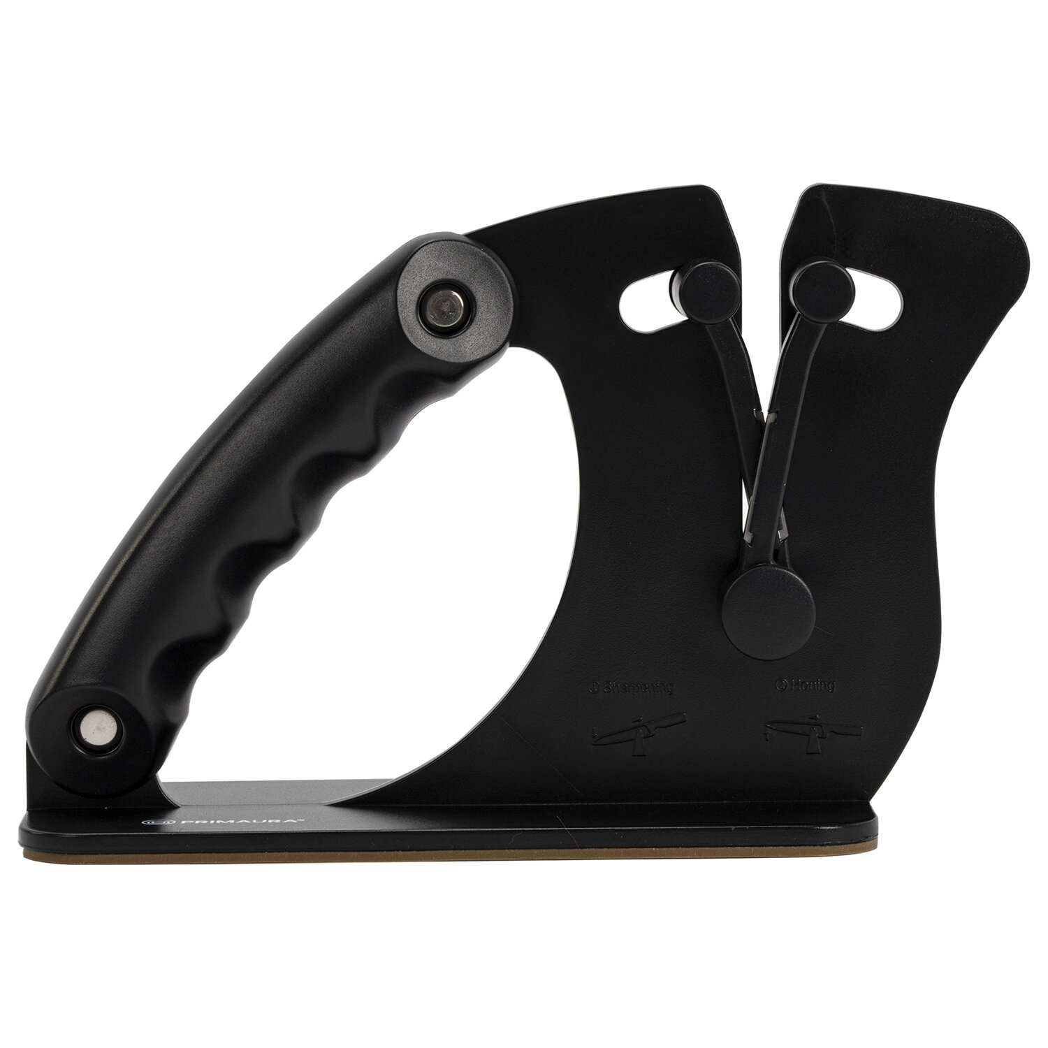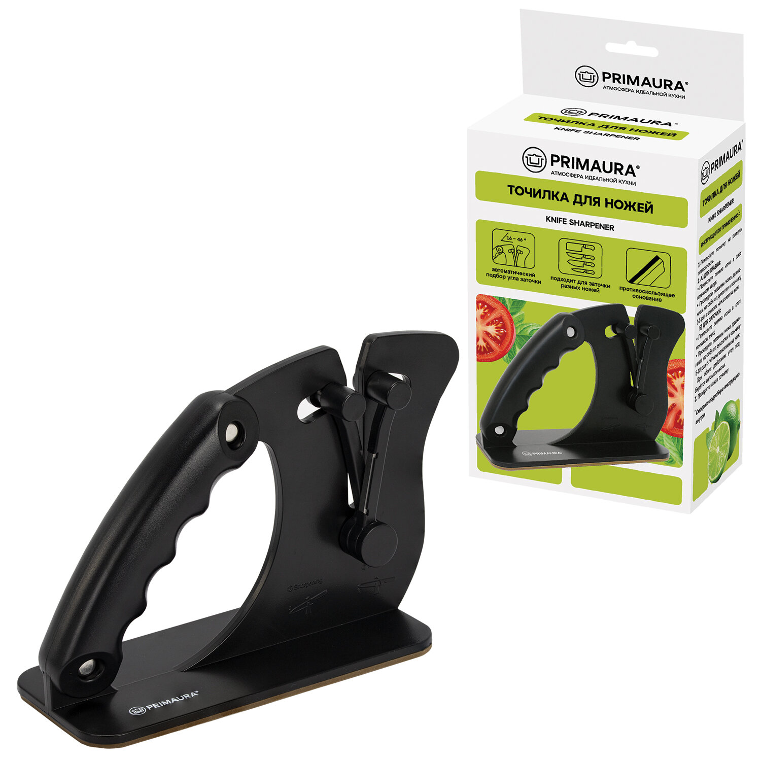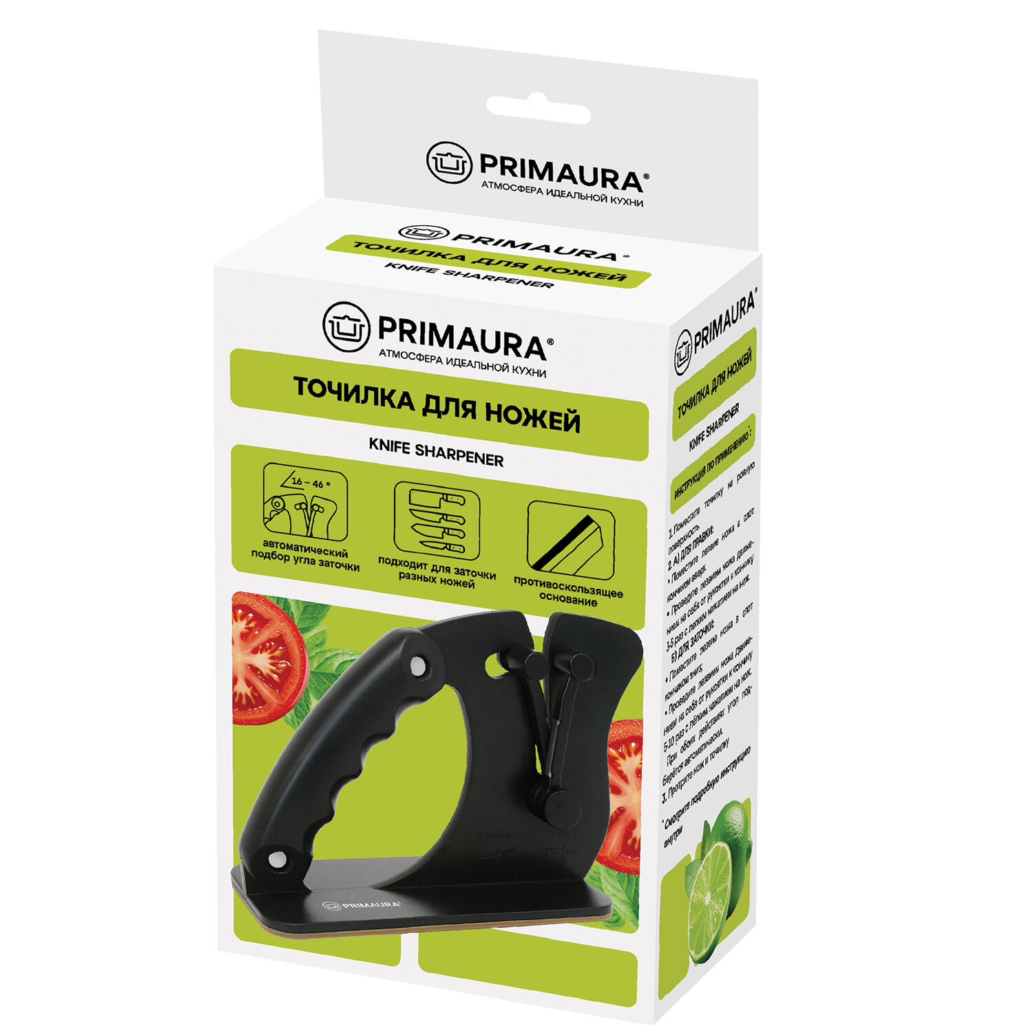 Точилка PRIMAURA предназначена для профессиональной заточки различных типов ножей. Устройство способно править и точить лезвие ножа. Главным преимуществом данной ножеточки является автоматический подбор угла (от 16° до 46°) заточки лезвия ножа, что позволяет достичь идеальной остроты лезвия без потери прочности ножа. Вставьте лезвие ножа в слот заточки и слегка надавите, угол заточки подберется автоматически.