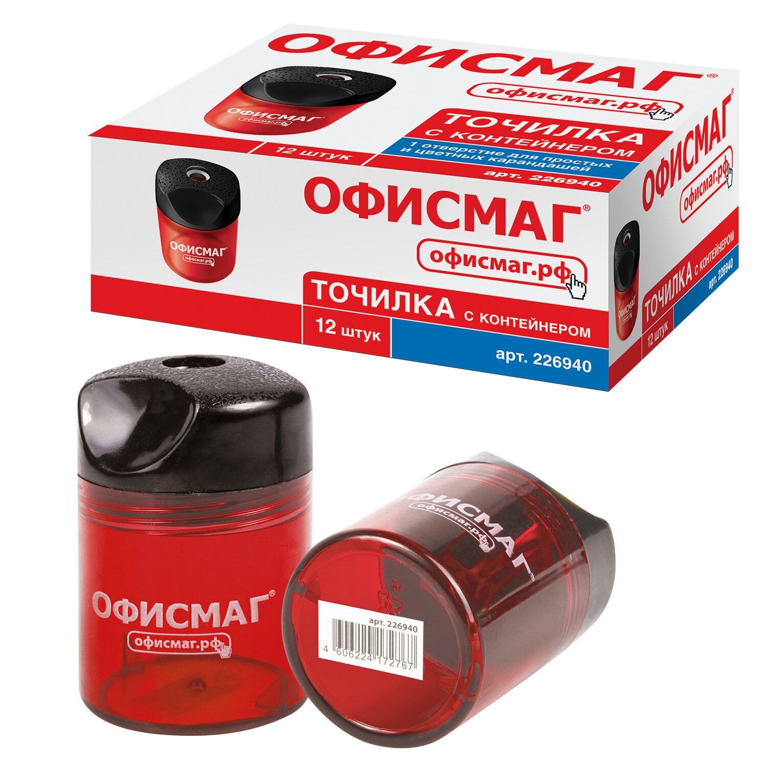 Точилка ОФИСМАГ с контейнером, пластиковая, цилиндрическая, красная, 226940
