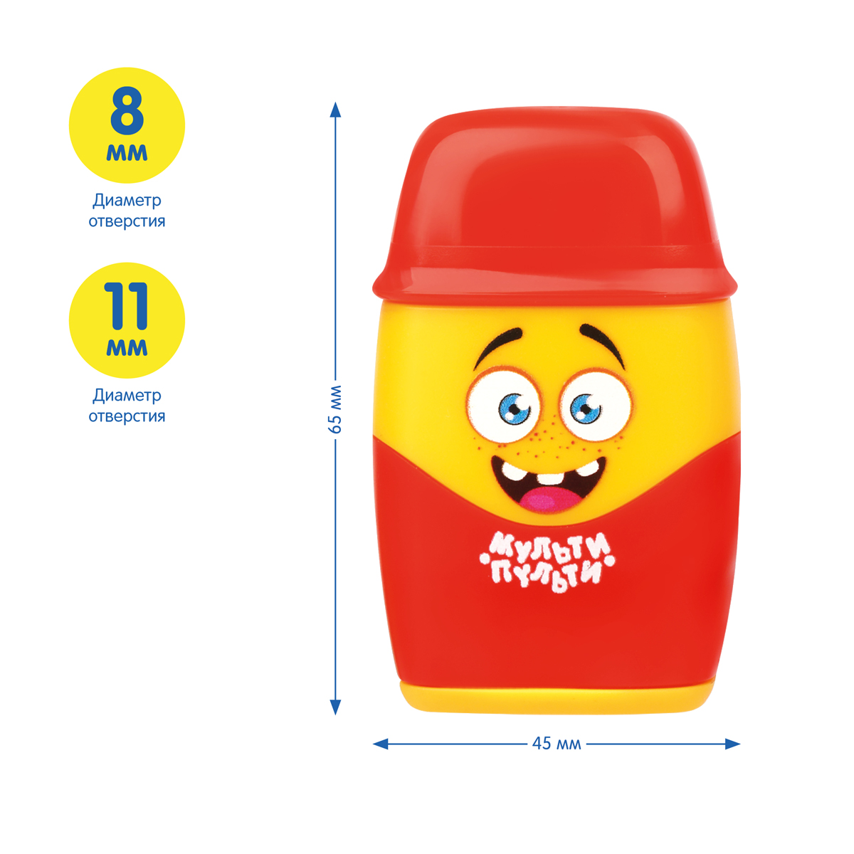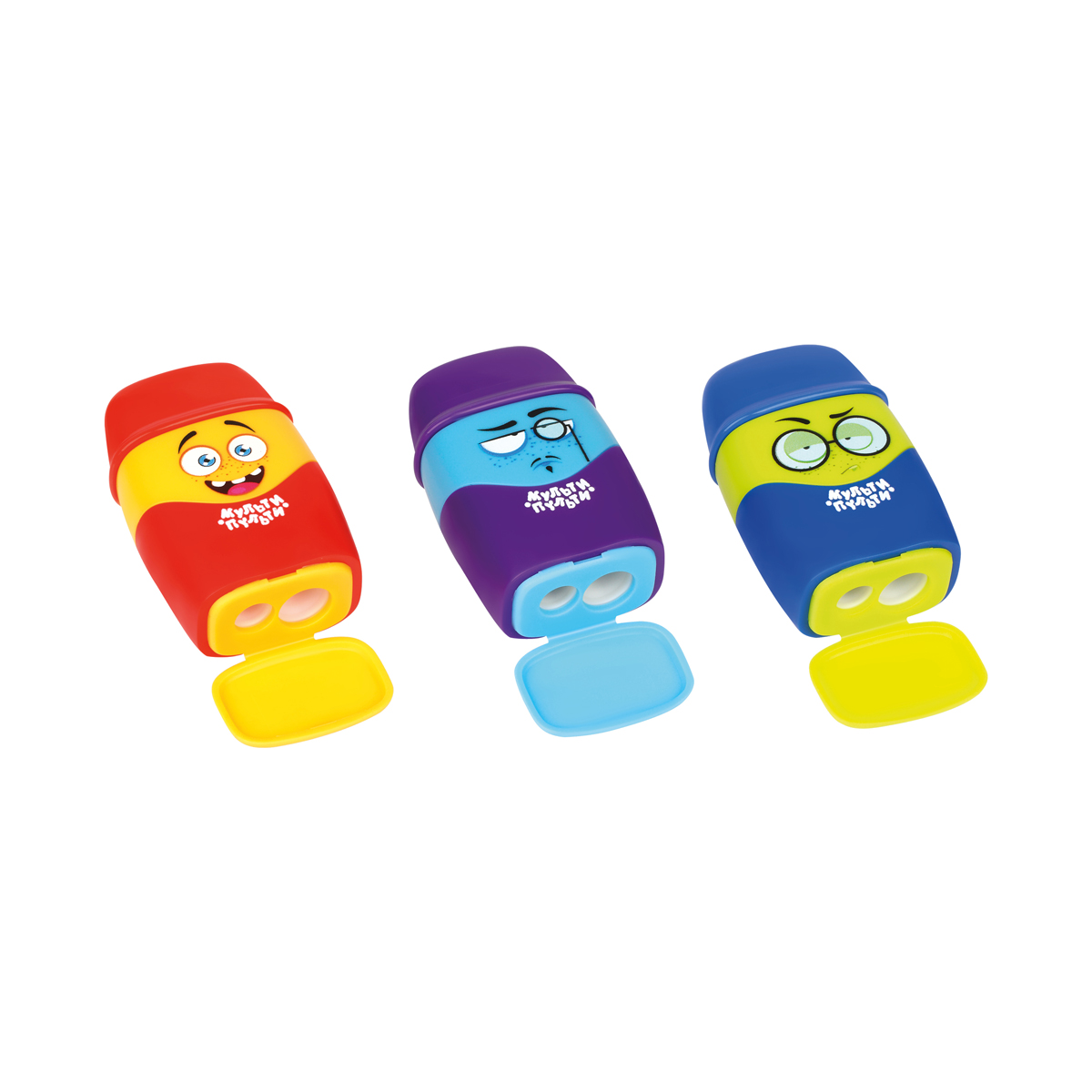 Пластиковая точилка «Мульти-Пульти» отлично справится с заточкой карандашей. Точилка «Человечки» содержит два отверстия для заточки – для стандартных карандашей диаметром до 8 мм и для карандашей формата «джамбо», диаметром до 12 мм. Точилка снабжена качественными ластиком, расположенным под верхней крышкой. В наборе представлены 3 варианта точилок с индивидуальным эмоциональным и цветовым оформлением. Вы можете выбрать одного героя, а можете собрать всех в свою коллекцию.